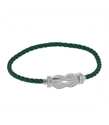 Bracelet moyen modèle stylisant un motif noeud d’hercule en or blanc serti de diamants, retenu par un câble vert torsadé interchangeable. Signé et numéroté.