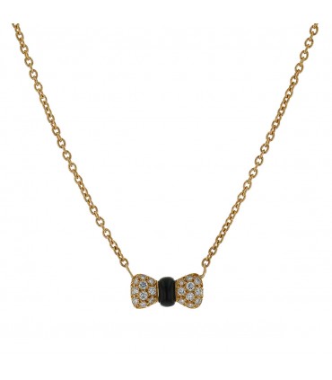 Collier en or jaune, orné d’un motif de noeud pavé de diamants avec le centre en onyx, maille forçat agrémentée d’un fermoir anneau ressort. Signé et numéroté.