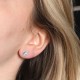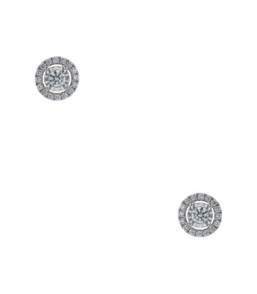 Boucles d’oreilles en or blanc, centrées d’un diamant taille rond facetté dans un entourage de diamants pour un poids total de 0,39 ct, couleur D-F, pureté VS.