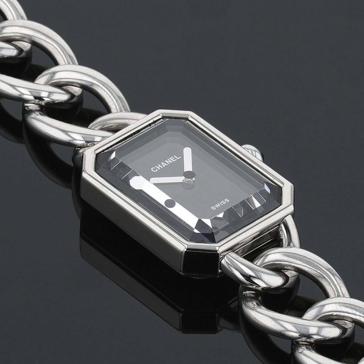 Montre bracelet de femme taille L en acier, cadran noir, lunette octogonale. Mouvement quartz. Bracelet en acier, maillons gourmette avec fermoir à cliquet. Signée et numérotée.