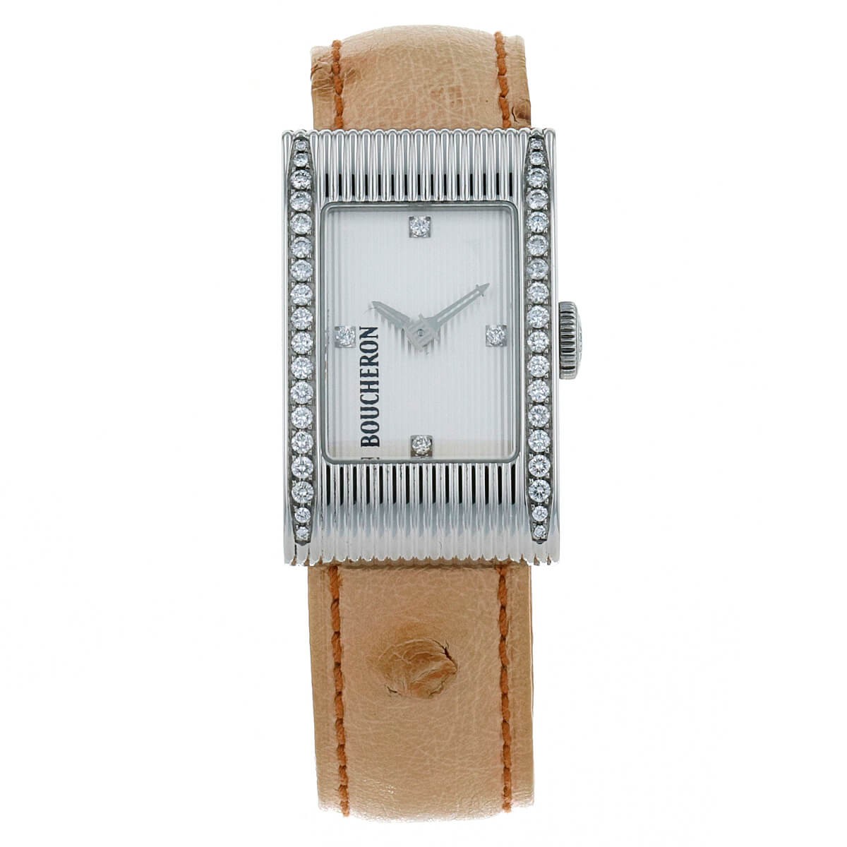 Montre bracelet de femme moyen modèle en acier, cadran argenté stylisé avec index diamants, lunette godronnée rehaussée de lignes de diamants. Mouvement quartz. Bracelet interchangeable en cuir d’autruche beige réglable avec fermoir à glissière. Signée et numérotée.