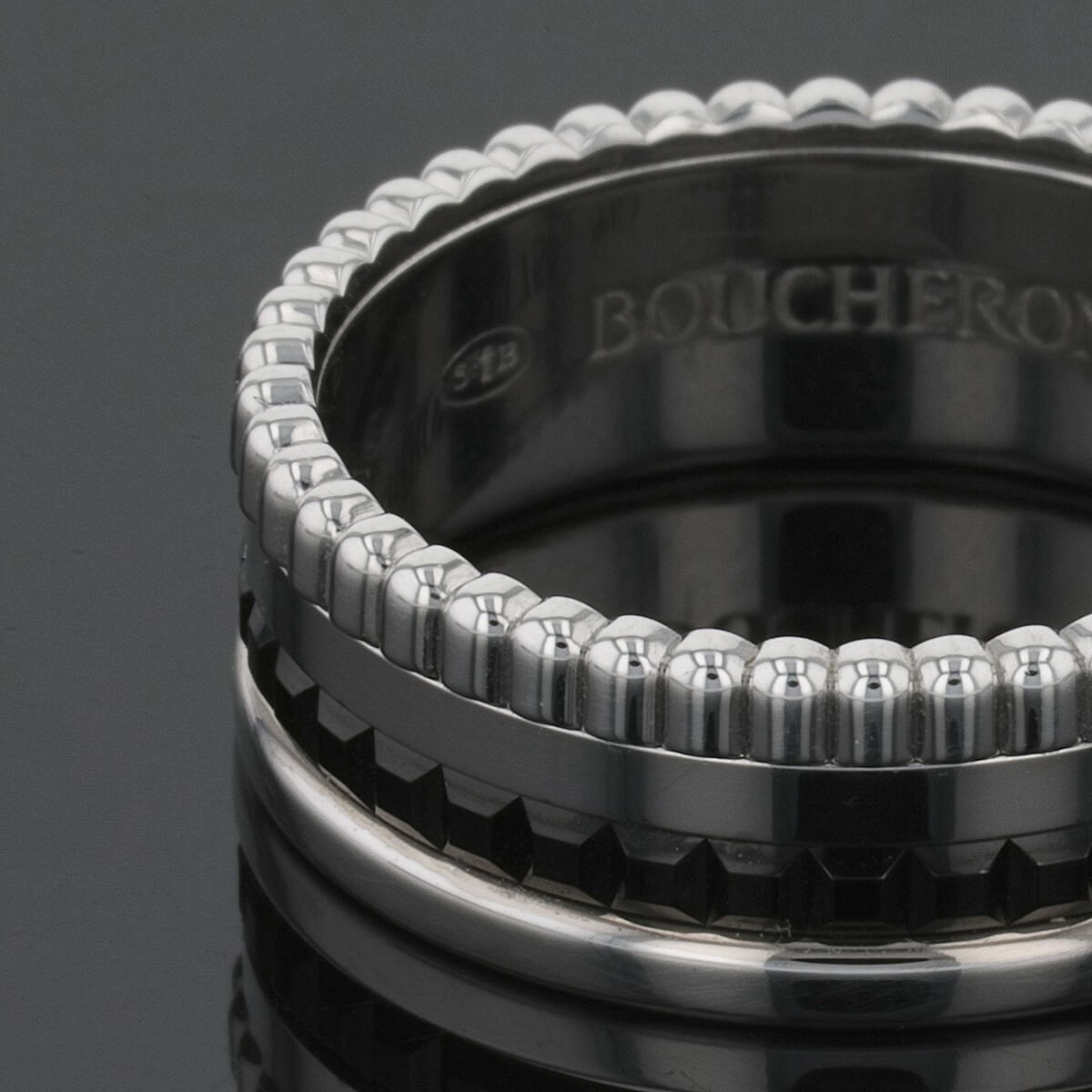 Bague en or blanc et PVD noir, stylisant 4 anneaux travaillés en relief aux motifs lisse poli, clous de Paris et godrons. Signée et numérotée.