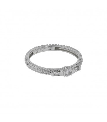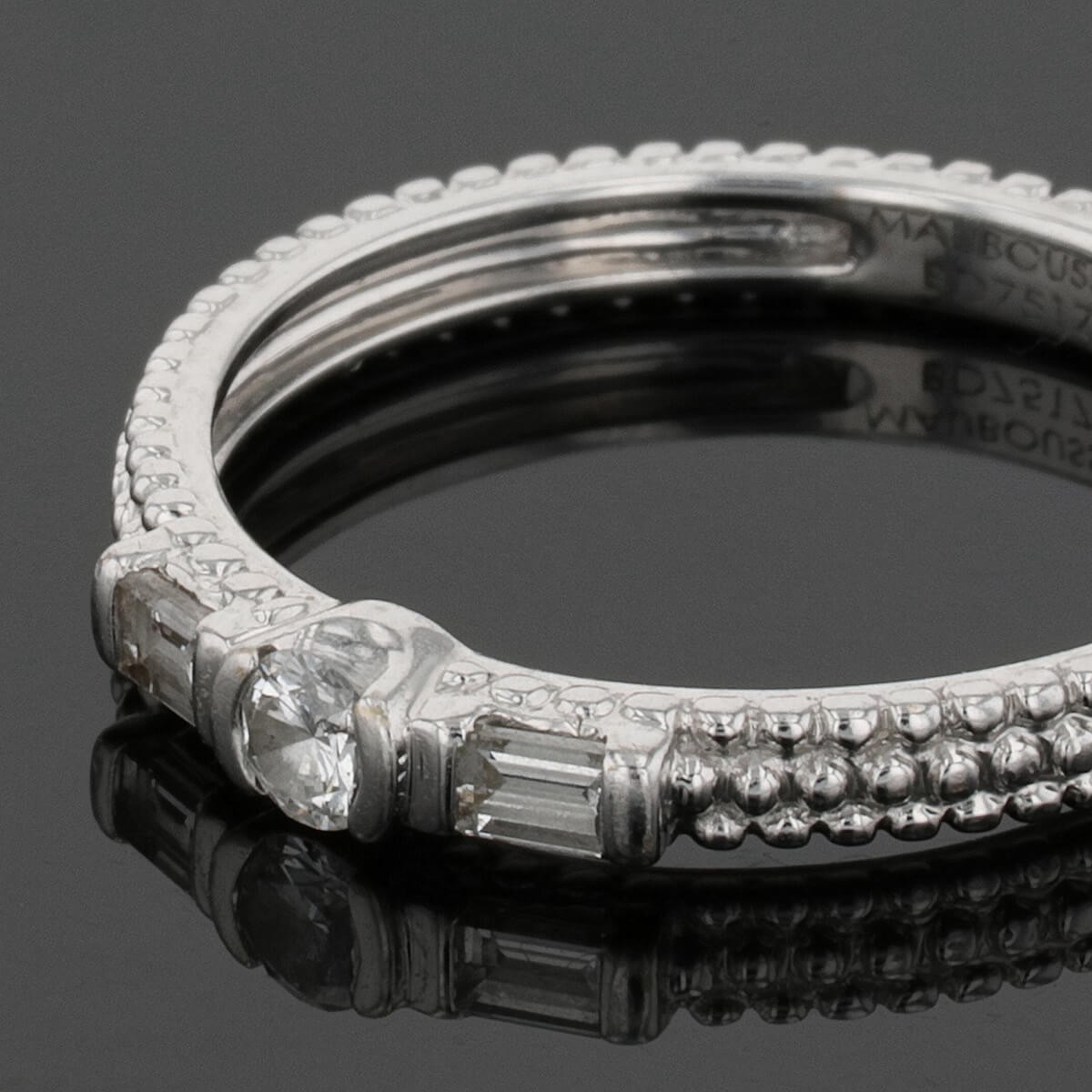 Bague en or blanc, composée d’un anneau perlé centré d’un diamant taille rond facetté épaulé de 2 diamants taille baguette. Signée et numérotée.