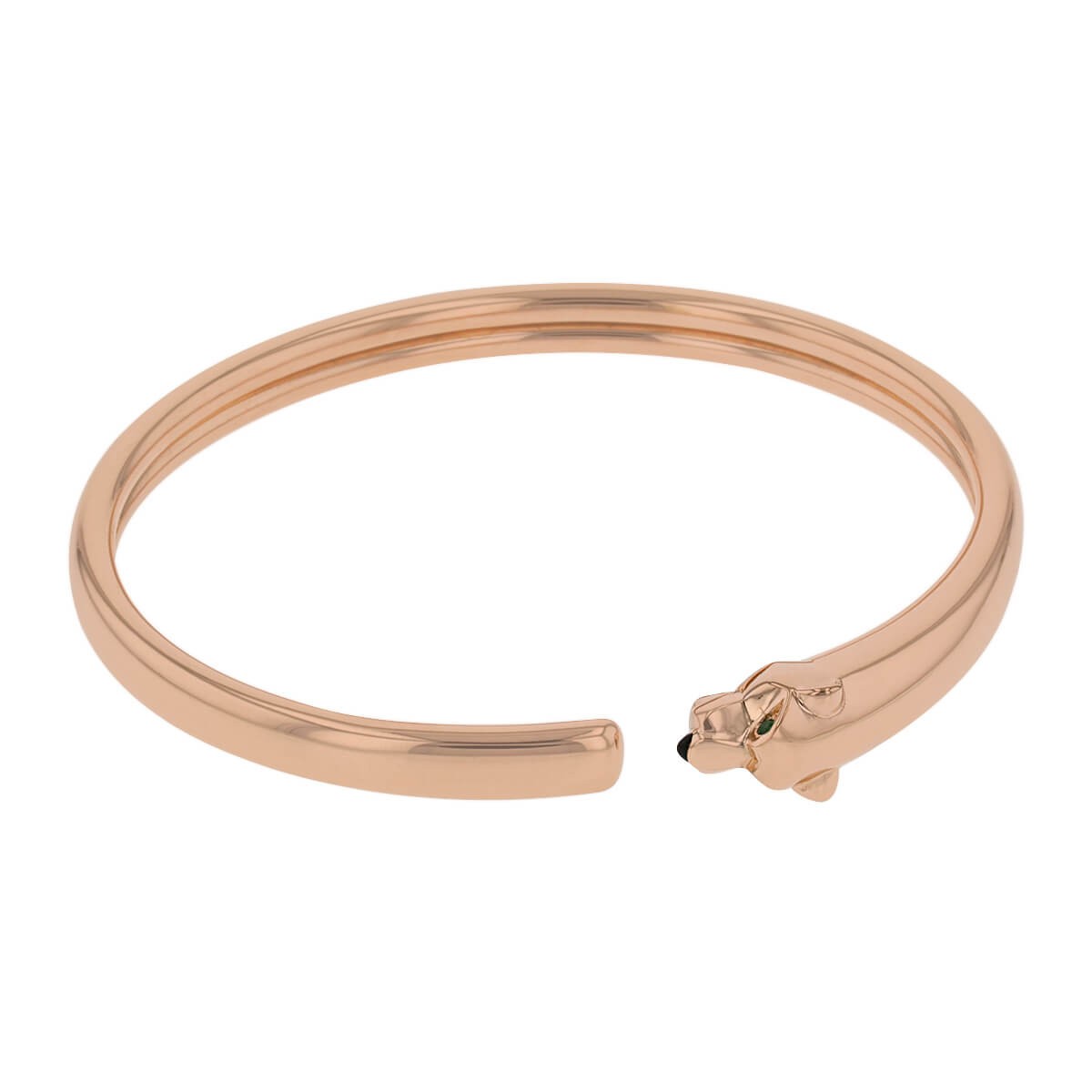 Bracelet flexible en or rose, stylisant une tête de panthère, les yeux en grenats tsavorites et le nez en onyx. Signé et numéroté.