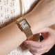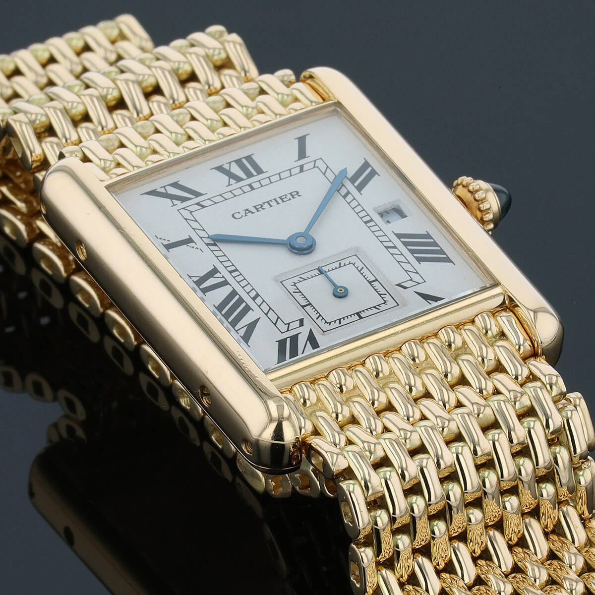 Montre bracelet en or jaune, cadran crème avec chiffres romains peints, chemin de fer pour les minutes, petite trotteuse à 6 heures, affichage de la date par guichet à 3 heures. Mouvement quartz. Bracelet en or jaune à maillons grains de riz avec boucle déployante en or jaune. Signée et numérotée.