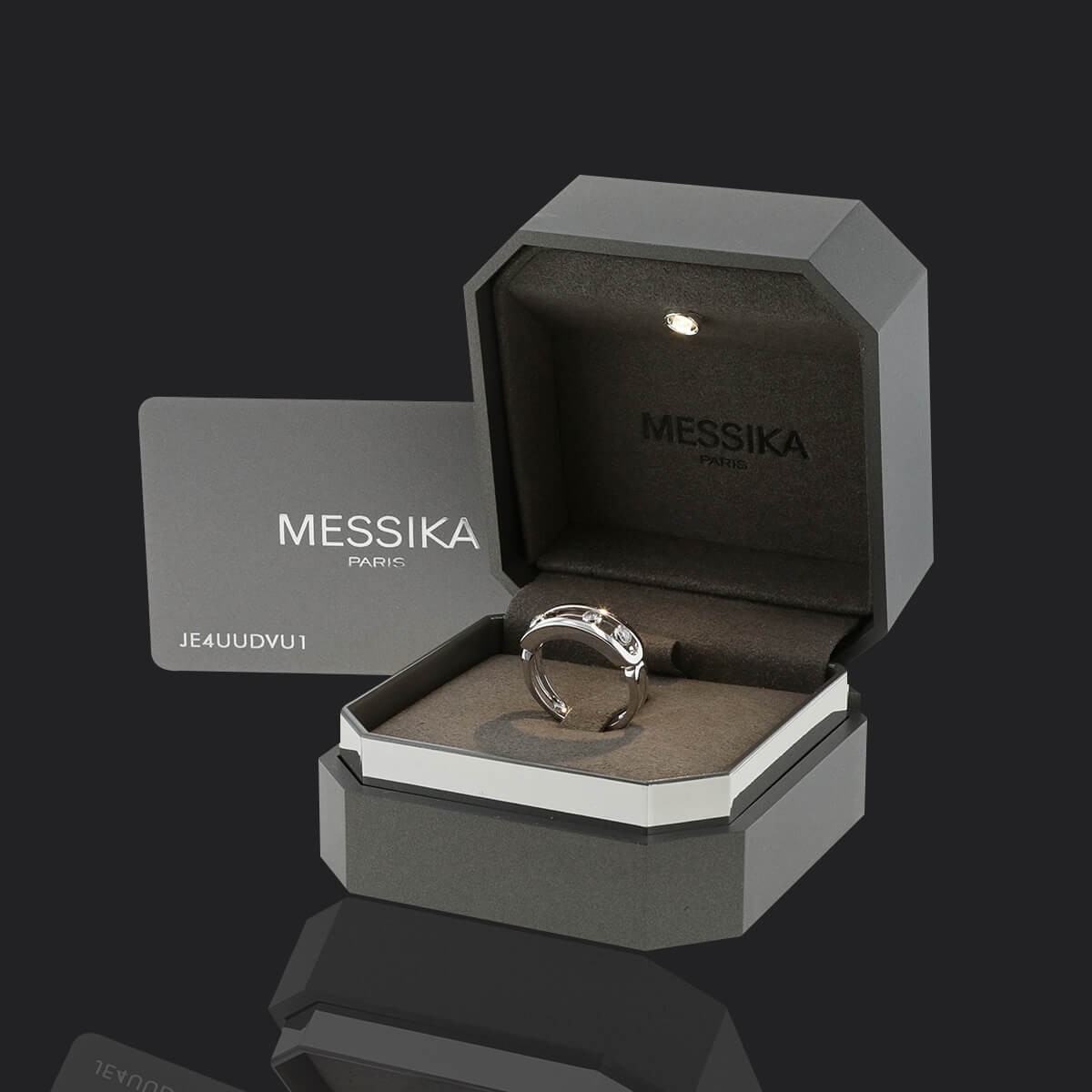 Bague en or blanc, à décor ajouré orné de 3 diamants mobiles. Signature ponctuée d’un diamant.