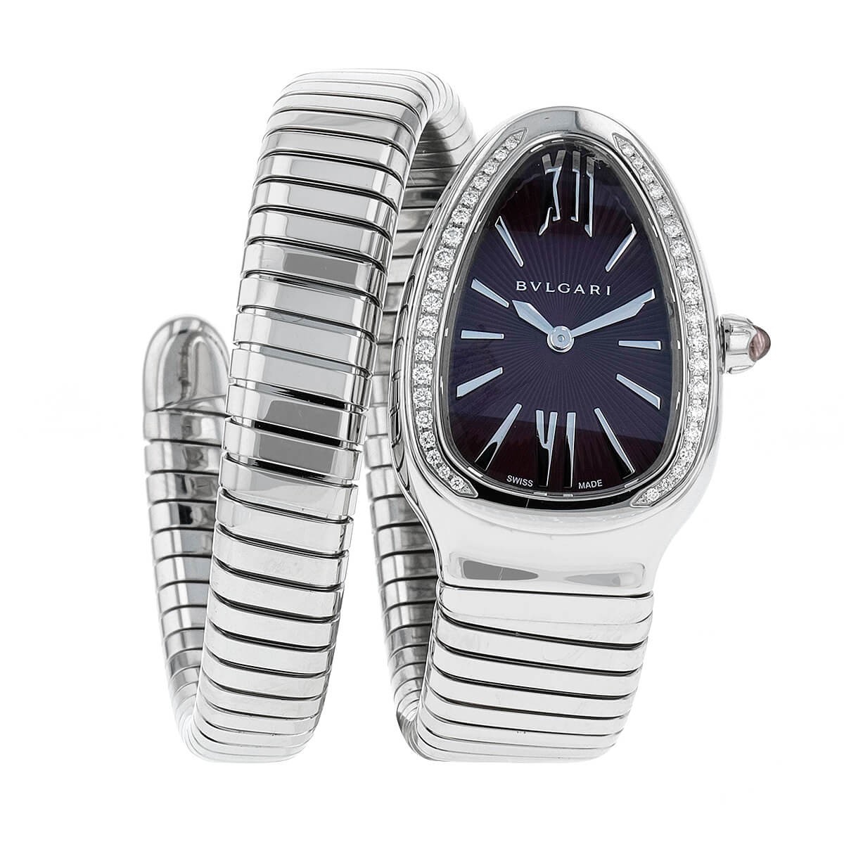 Montre bracelet de femme en acier, cadran violet stylisé avec chiffres romains et index appliqués, lunette ornée de diamants. Mouvement quartz. Bracelet en acier, maille tubogas. Signée et numérotée.