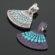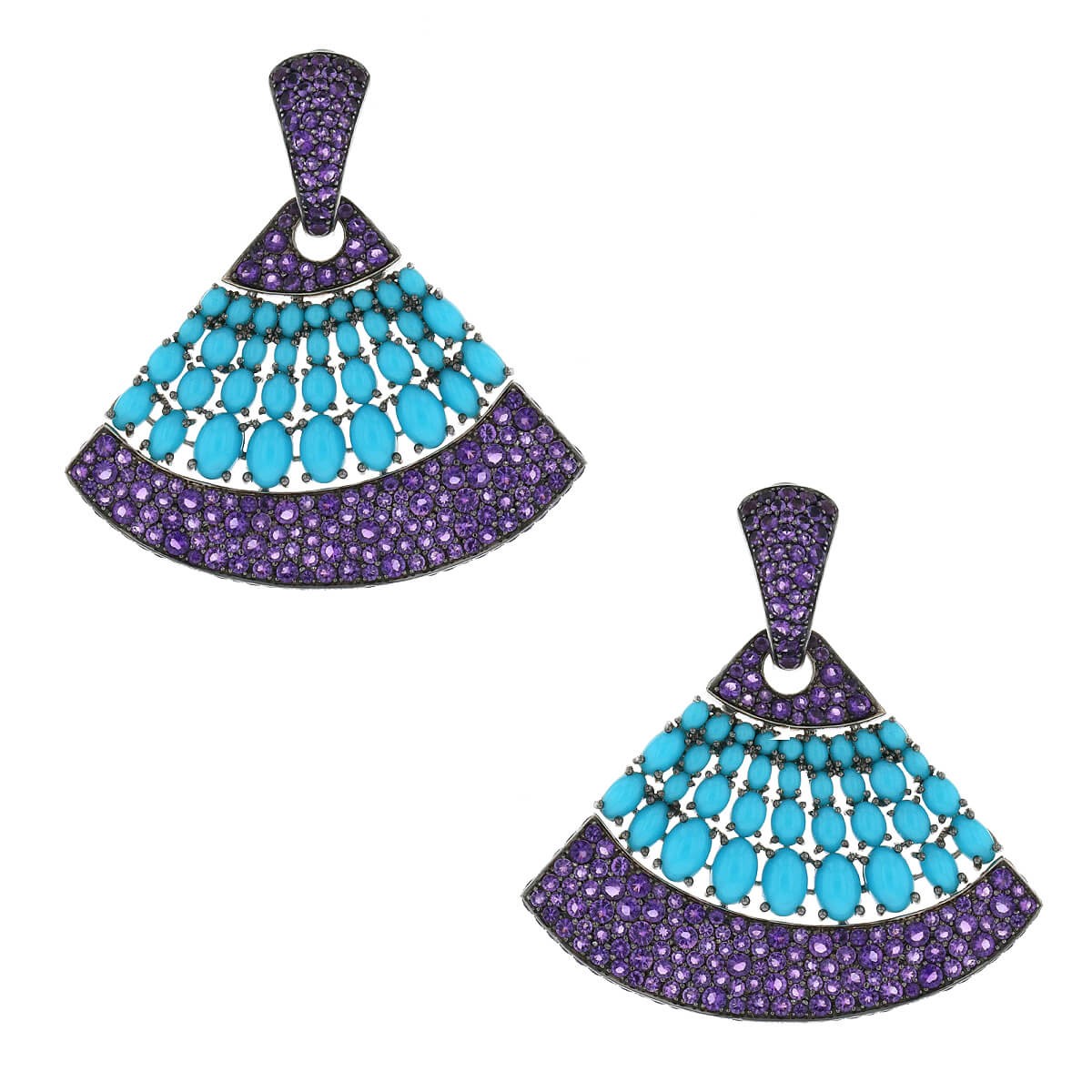 Boucles d’oreilles en or blanc, composées d’un anneau serti d’améthystes sur de l’or rhodié noir et retenant en pampille un motif d’éventail serti d’améthystes et de turquoises taille cabochon sur de l’or rhodié noir.