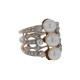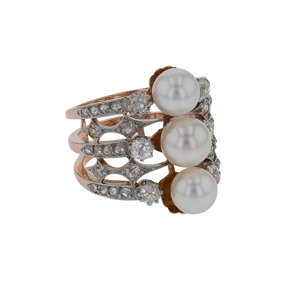 Bague 2 tons d’or, composée d’un triple anneau rehaussé de diamants taille ancienne sur or blanc et centrés de trois perles de culture.