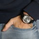 Montre bracelet d’homme en acier, cadran argenté avec index appliqués, phase de lune à 6 heures. Fond transparent dévoilant son mouvement automatique. Bracelet neuf signé en crocodile noir avec boucle déployante signée en acier. Signée et numérotée.
