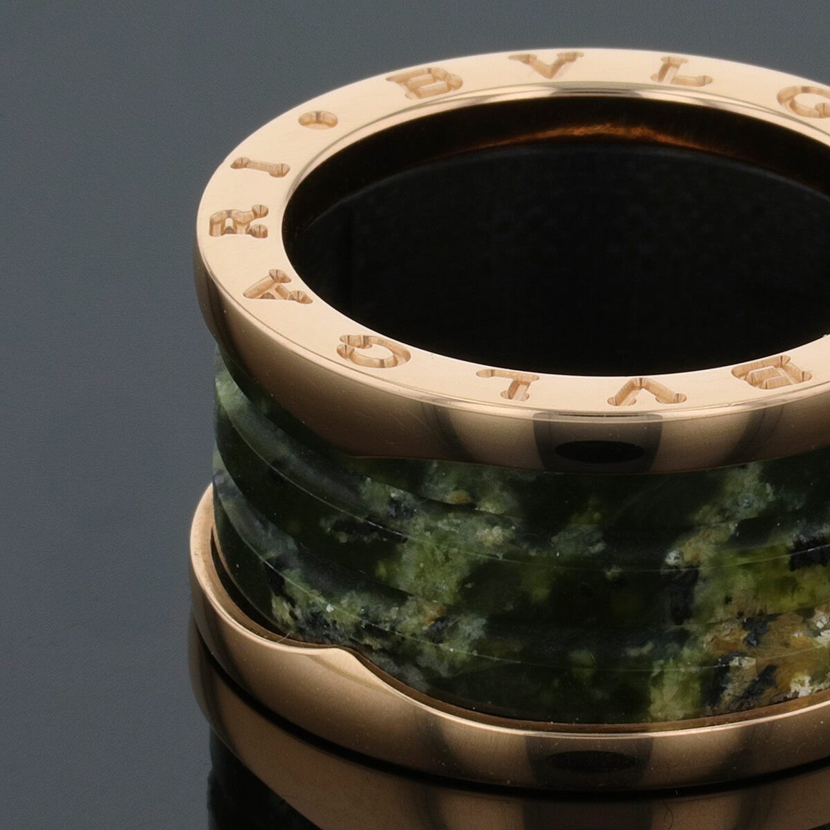 Bague en or rose et marbre vert, stylisant un large anneau en spirale gravé Bvlgari. Signée et numérotée.
