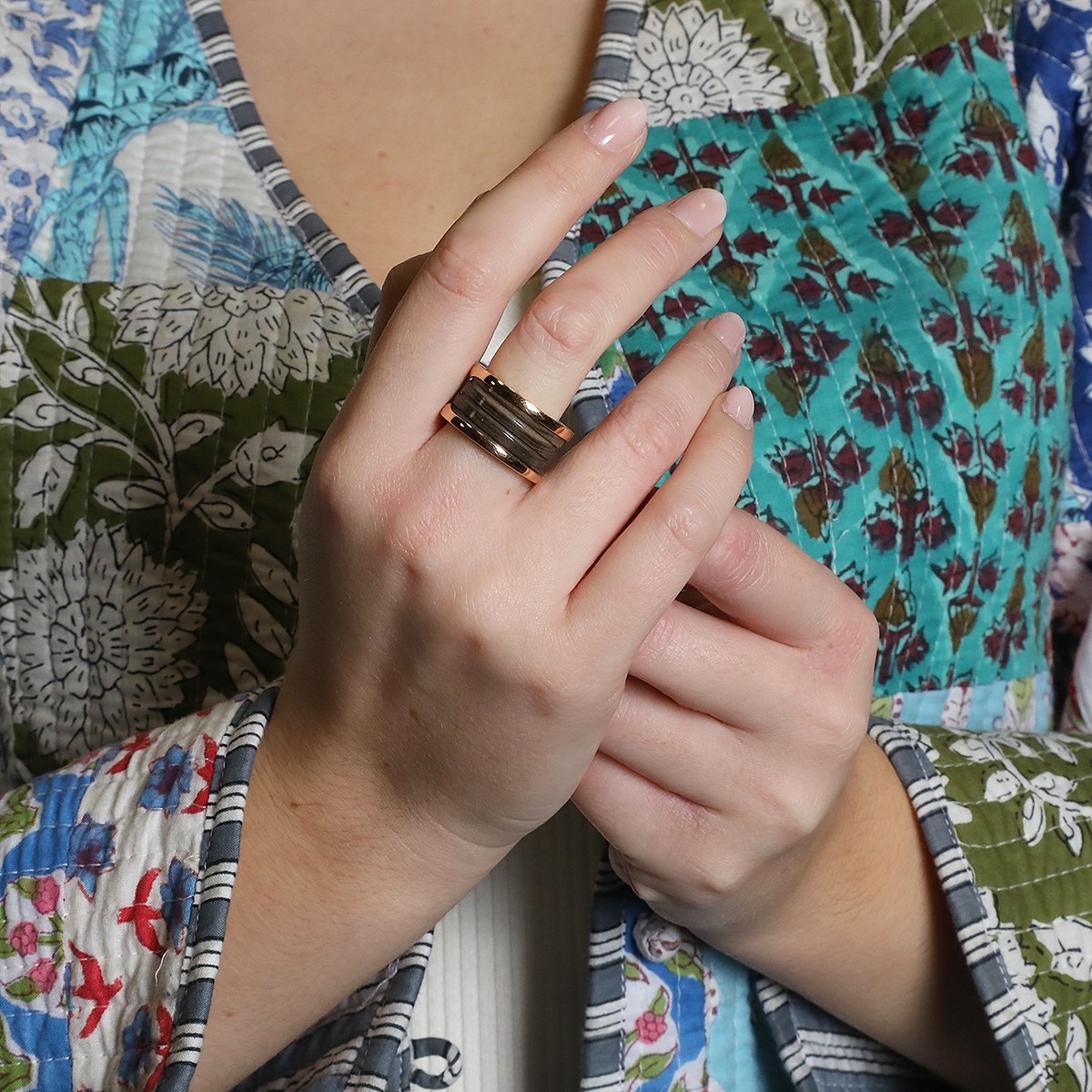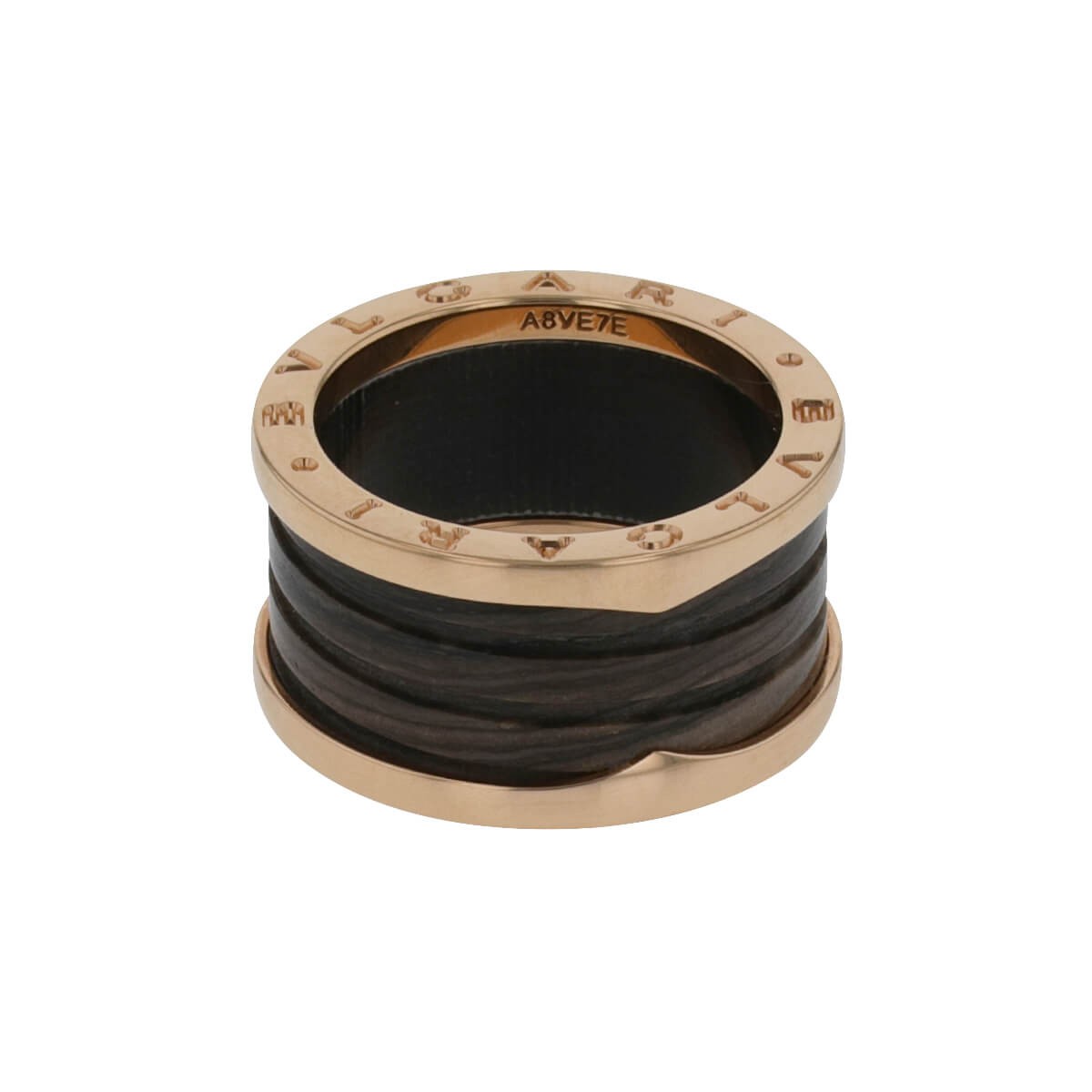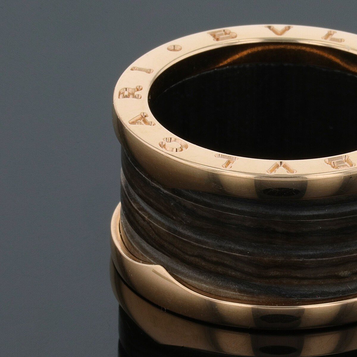 Bague en or rose et marbre marron, stylisant un large anneau en spirale gravé Bvlgari. Signée et numérotée.