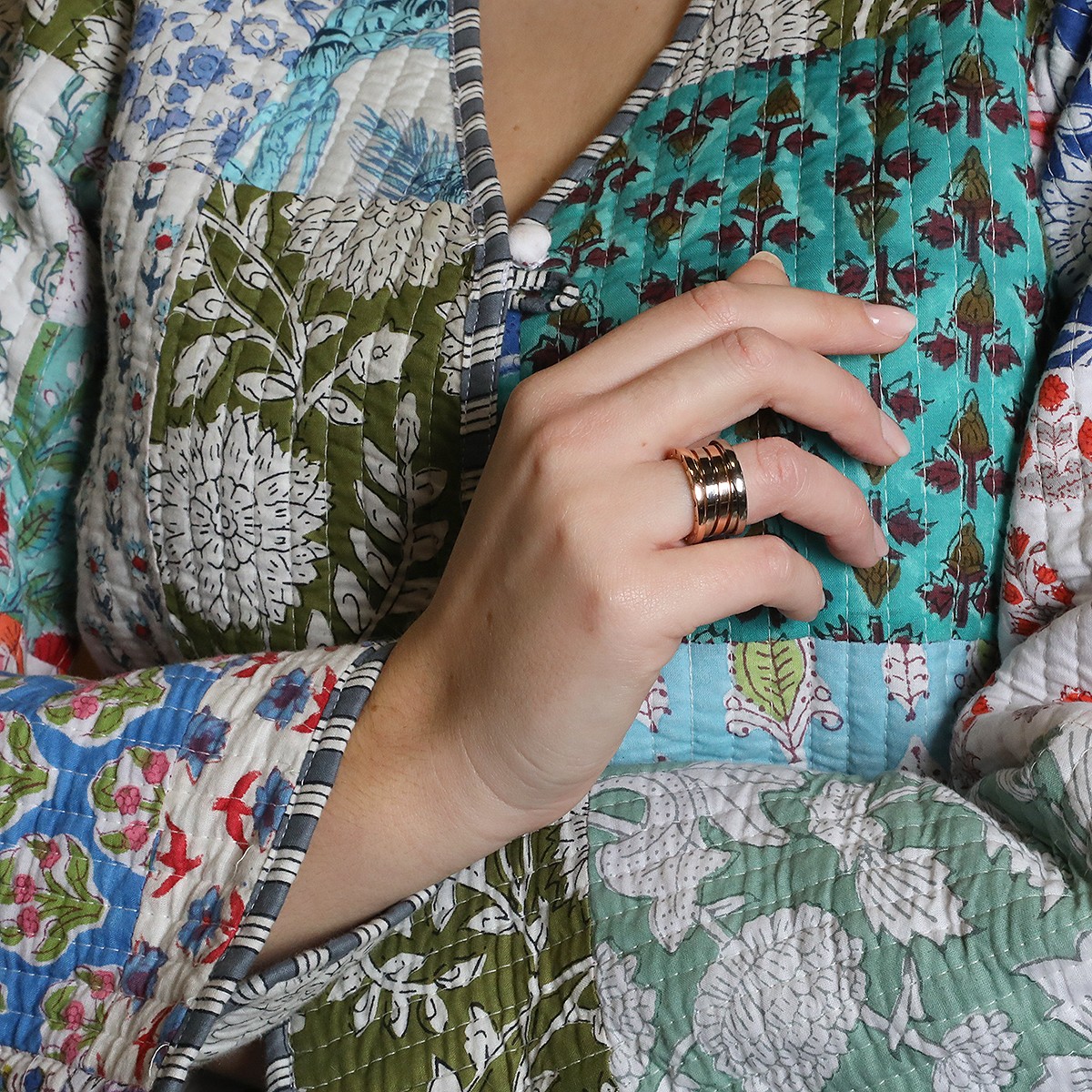Bague 2 tons d’or, stylisant un large anneau en spirale légèrement mobile gravé Bvlgari en or blanc et or rose. Signée et numérotée.