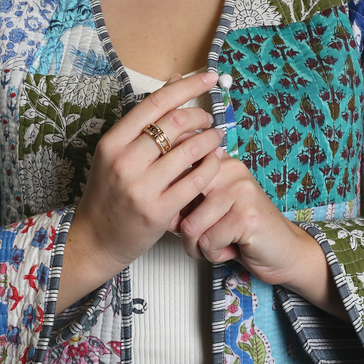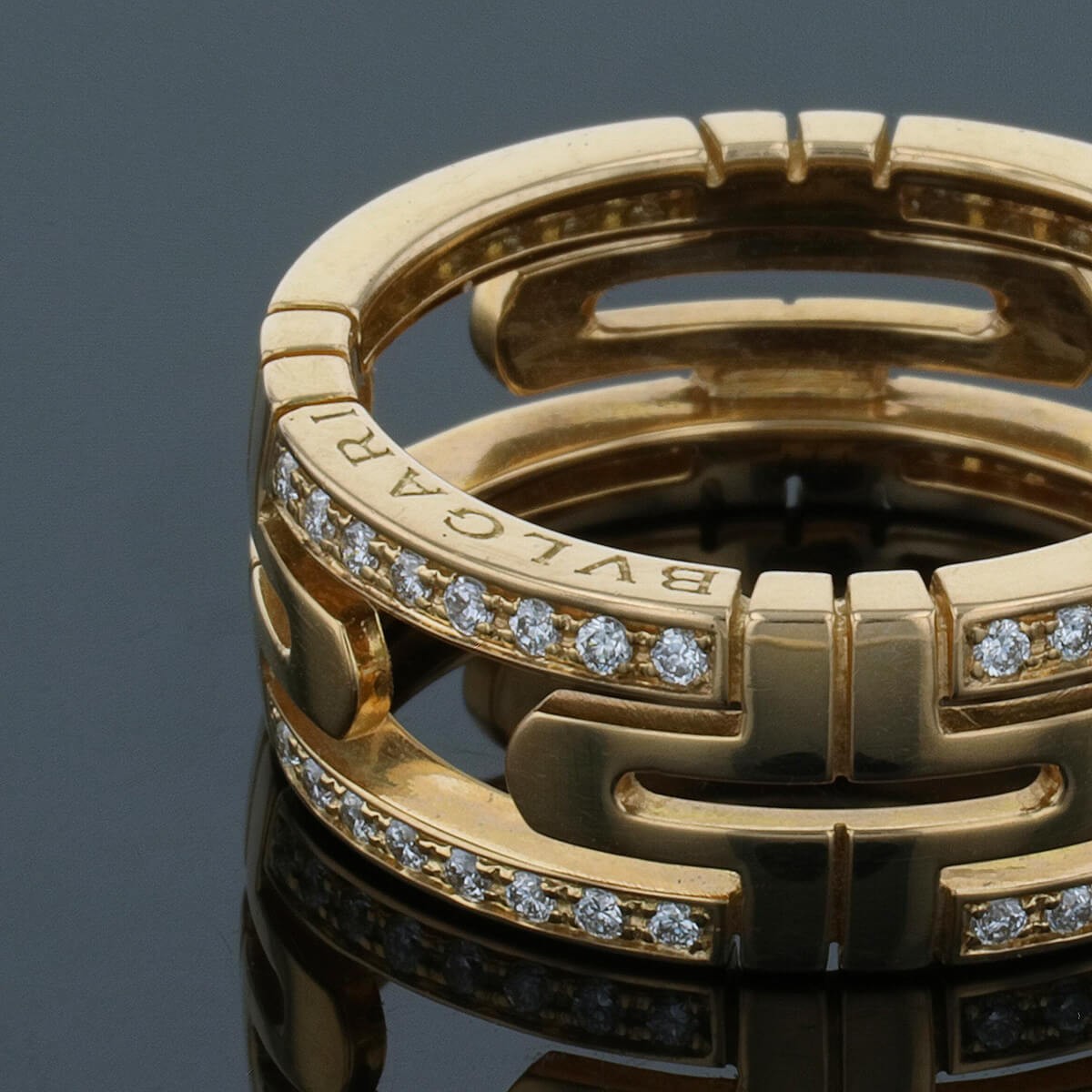 Bague en or jaune, à décor géométrique ajouré gravé “Bvlgari” rehaussé de diamants. Signée.