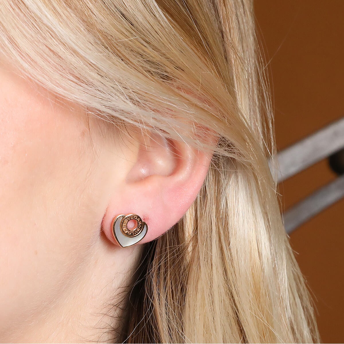 Boucles d’oreilles en or rose, stylisant un coeur en nacre blanche rehaussé d’une pastille gravée “Bvlgari”. Signées et numérotées.