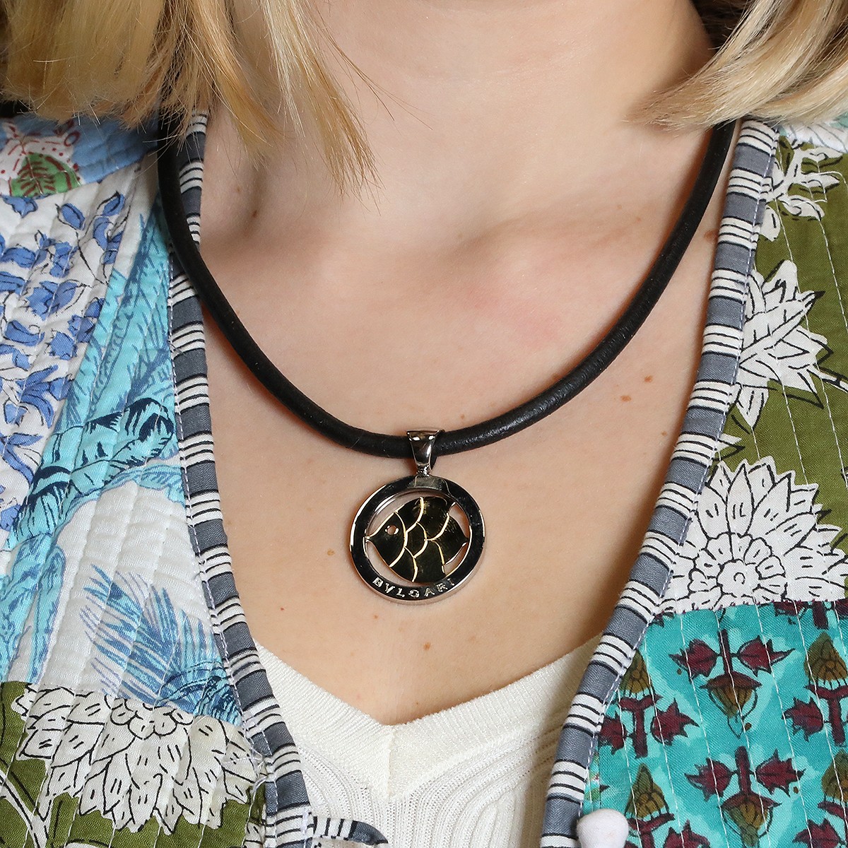 Collier en acier et or jaune, composé d’un cordon en cuir retenant un pendentif ajouré stylisant un poisson en or jaune dans un cercle gravé “Bvlgari” en acier. Signé.