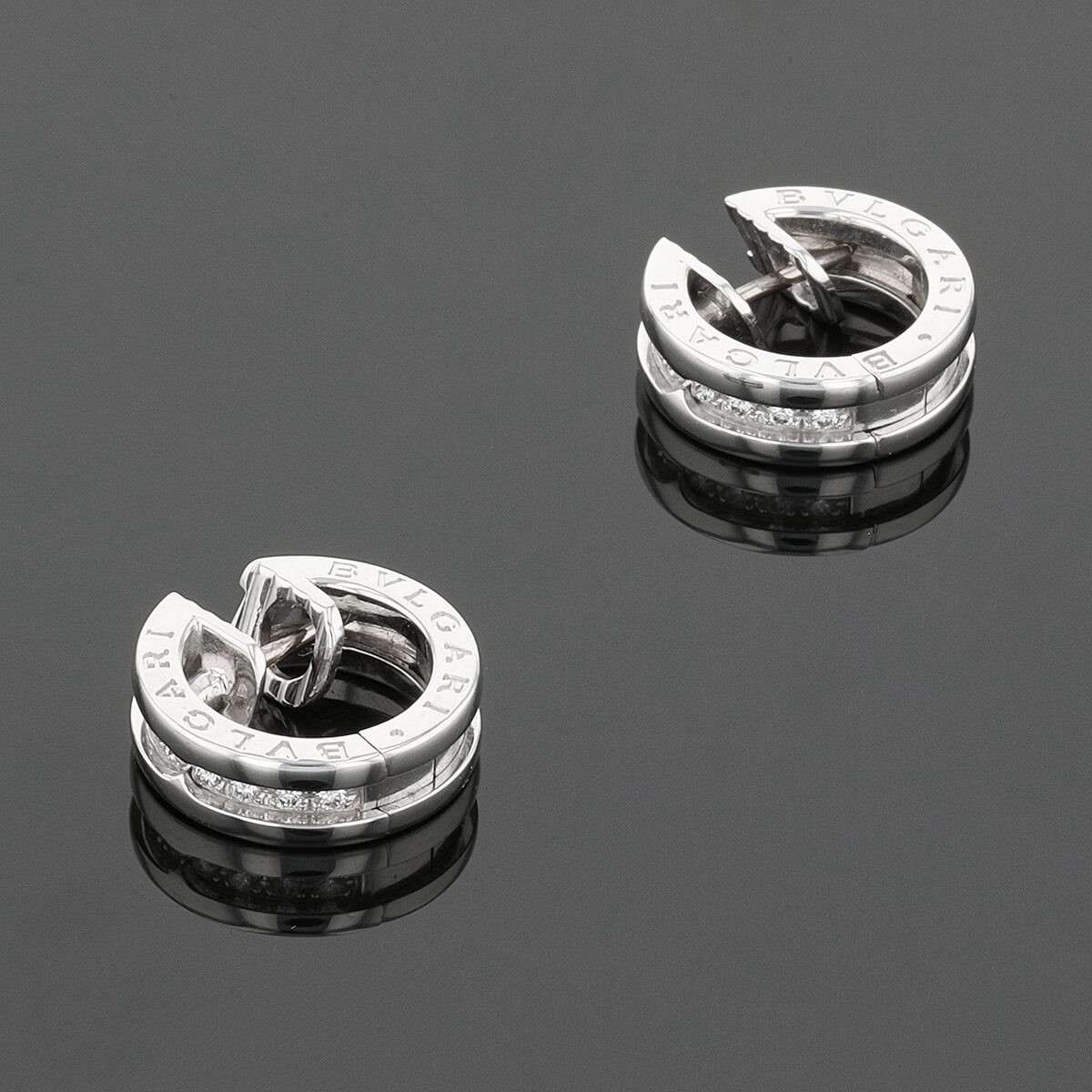 Boucles d’oreilles en or blanc, stylisant un anneau gravé Bvlgari partiellement serti de diamants. Signées et numérotées.