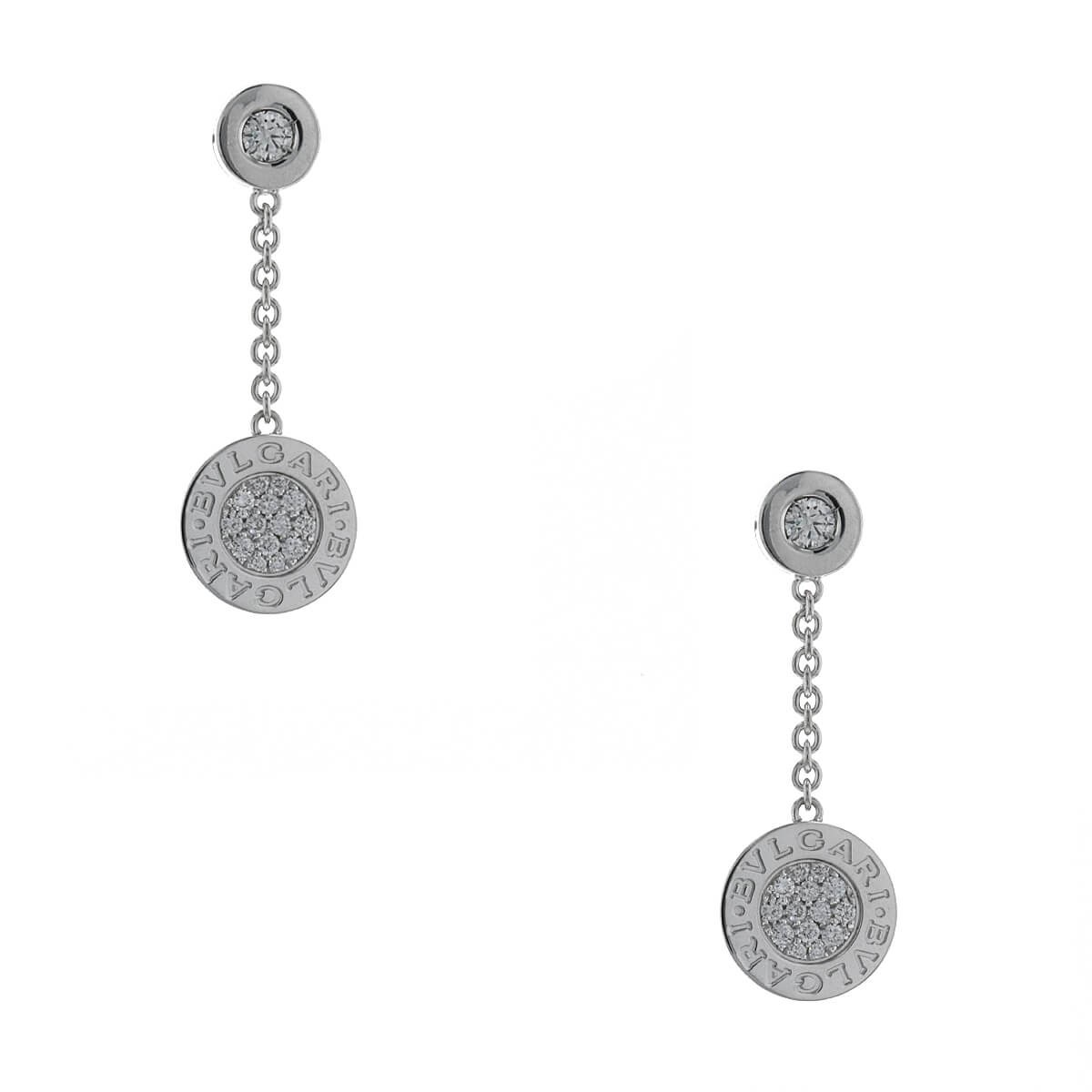 Boucles d’oreilles en or blanc, composées d’une maille forçat retenant 2 pastilles, l’une sertie d’un diamant, la seconde rehaussée d’un pavage de diamants et gravée “Bvlgari”. Signées et numérotées.