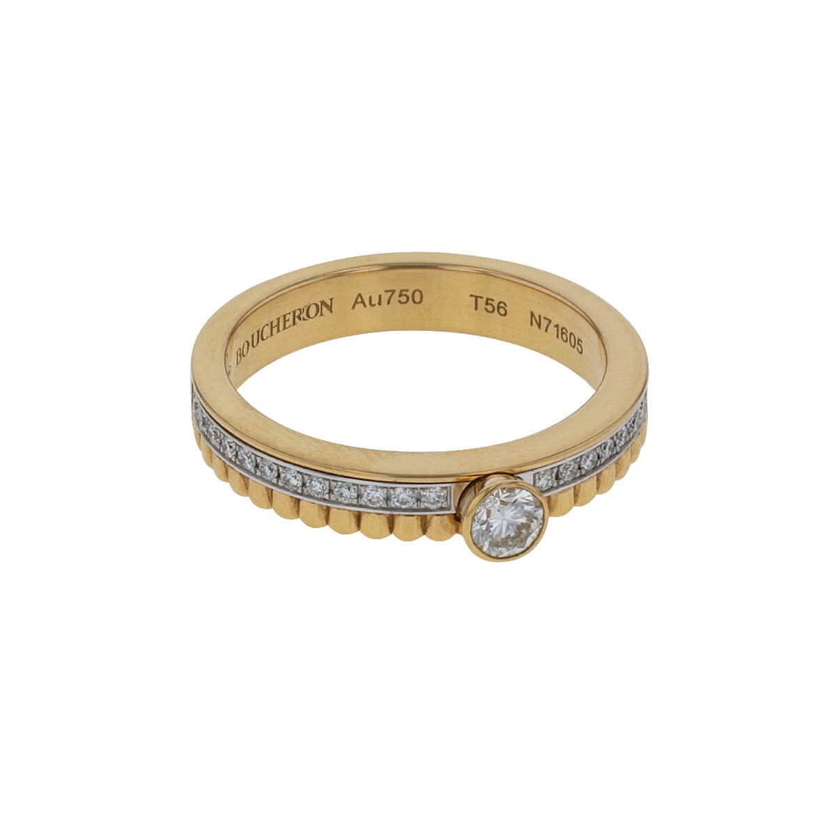 Bague 2 tons d’or, composée d’un anneau aux motifs godrons et d’un anneau serti d’un tour complet de diamants rehaussé d’un diamant taille rond facetté en serti clos d’environ 0,2 ct. Signée et numérotée.