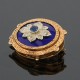 Ancien fermoir de collier transformé en broche pendentif en or jaune, formant un médaillon, la monture finement ciselée suivant des motifs de fleurs et volutes, centré d’émail bleu et rehaussé d’un motif floral en or blanc serti de diamants taille ancienne et d’un saphir taille rond facetté en serti clos.