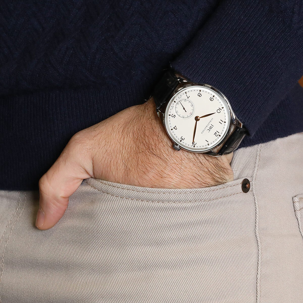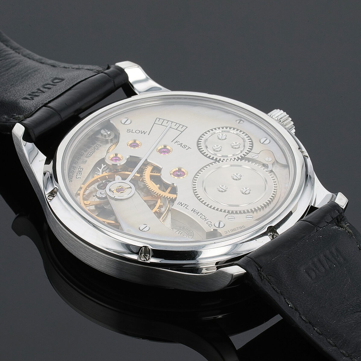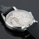 Montre en acier, cadran argenté avec chiffres arabes appliqués, chemin de fer pour les minutes. Petite trotteuse à 6 heures. Fond transparent dévoilant son mouvement mécanique. Bracelet en crocodile noir signé usagé avec boucle ardillon en acier. Signée et numérotée. Écrin légèrement usagé.