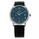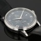 Montre bracelet d’homme en acier, cadran bleu rayonnant avec chiffres romains appliqués, indication de la date par guichet à 3 heures, indicateur de réserve de marche à 6 heures, petite trotteuse à 9 heures, lunette godronnée. Mouvement automatique. Bracelet en crocodile noir signé usagé avec boucle ardillon en acier. Signée et numérotée.
