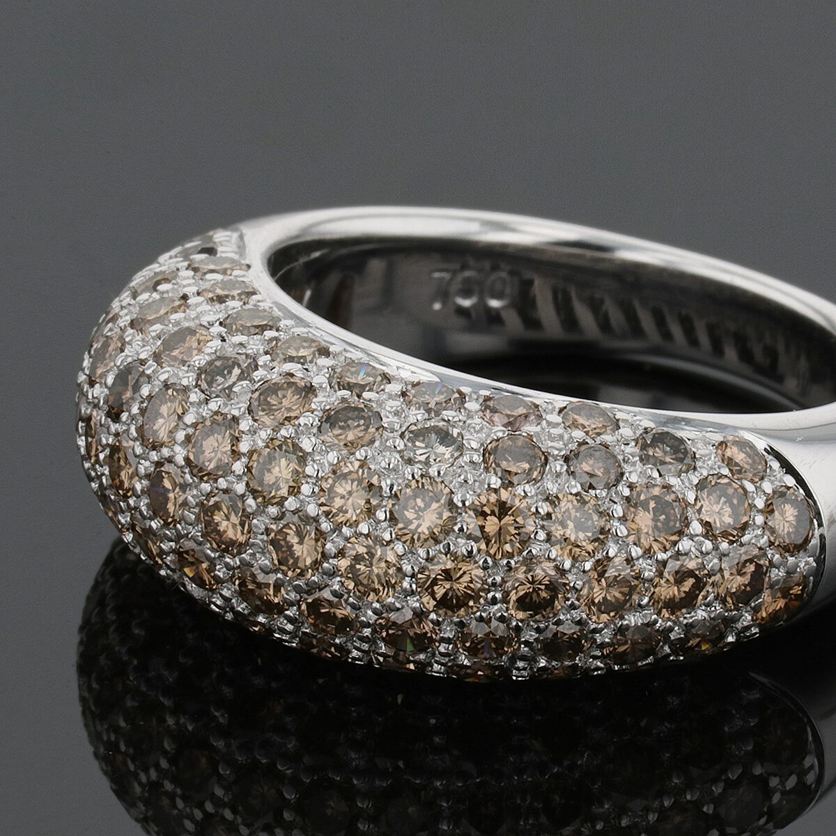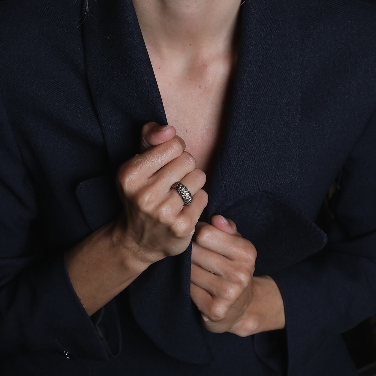 Bague jonc en or blanc, ornée d’un pavage de diamants couleur cognac sur de l’or noirci.