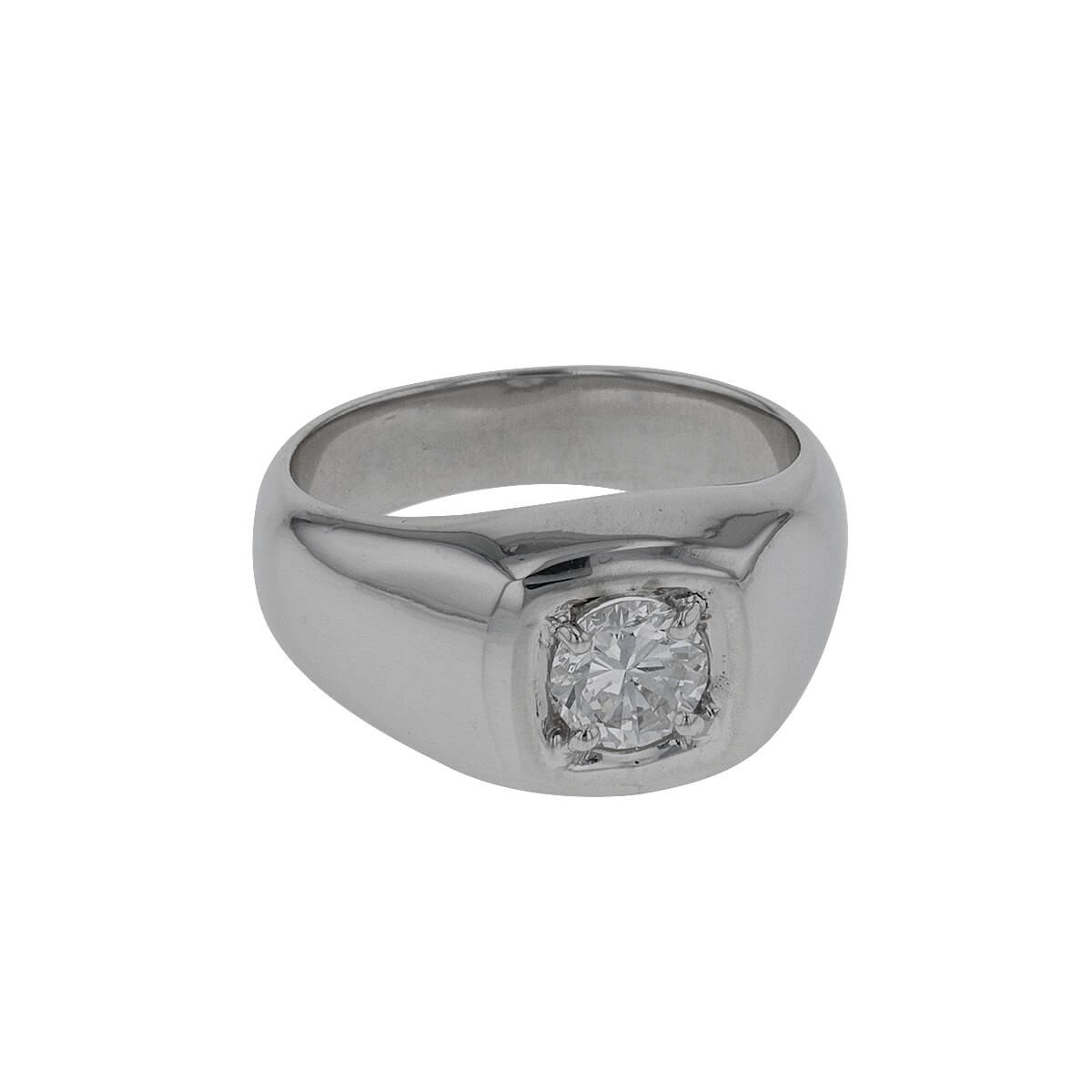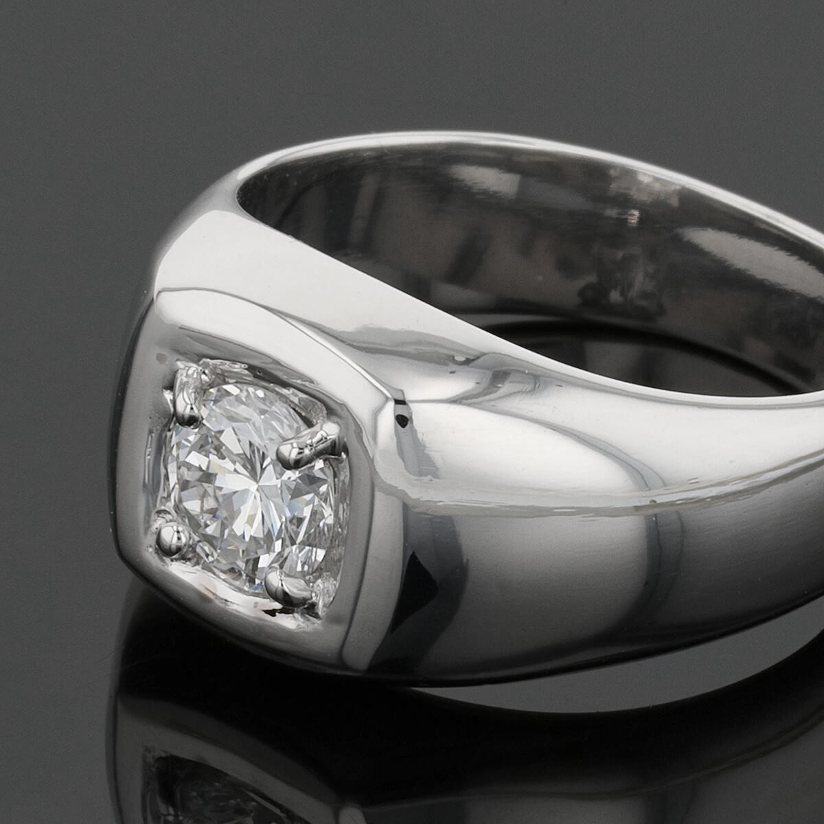 Bague jonc en platine, centrée d’un diamant taille rond facetté en serti griffes. Accompagnée d’un certificat LFG attestant d’un diamant de 0,70 ct, couleur E, pureté VS1.