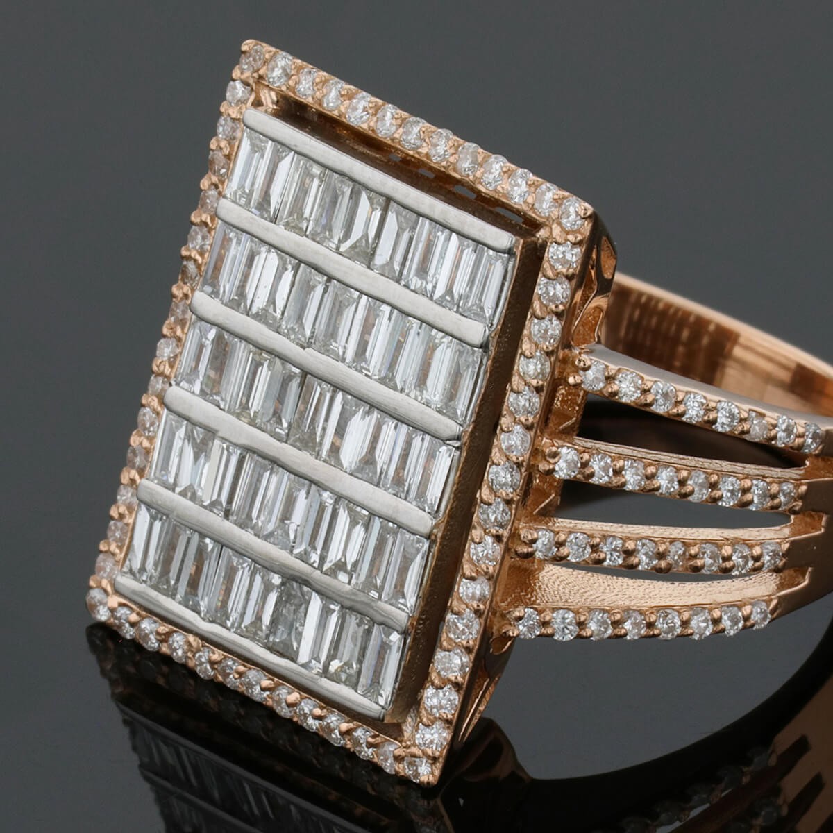 Bague 2 tons d’or, centrée d’un plateau rectangulaire en or blanc pavé de diamants taille baguette en serti rails, rehaussé d’une monture en or rose partiellement sertie de diamants.