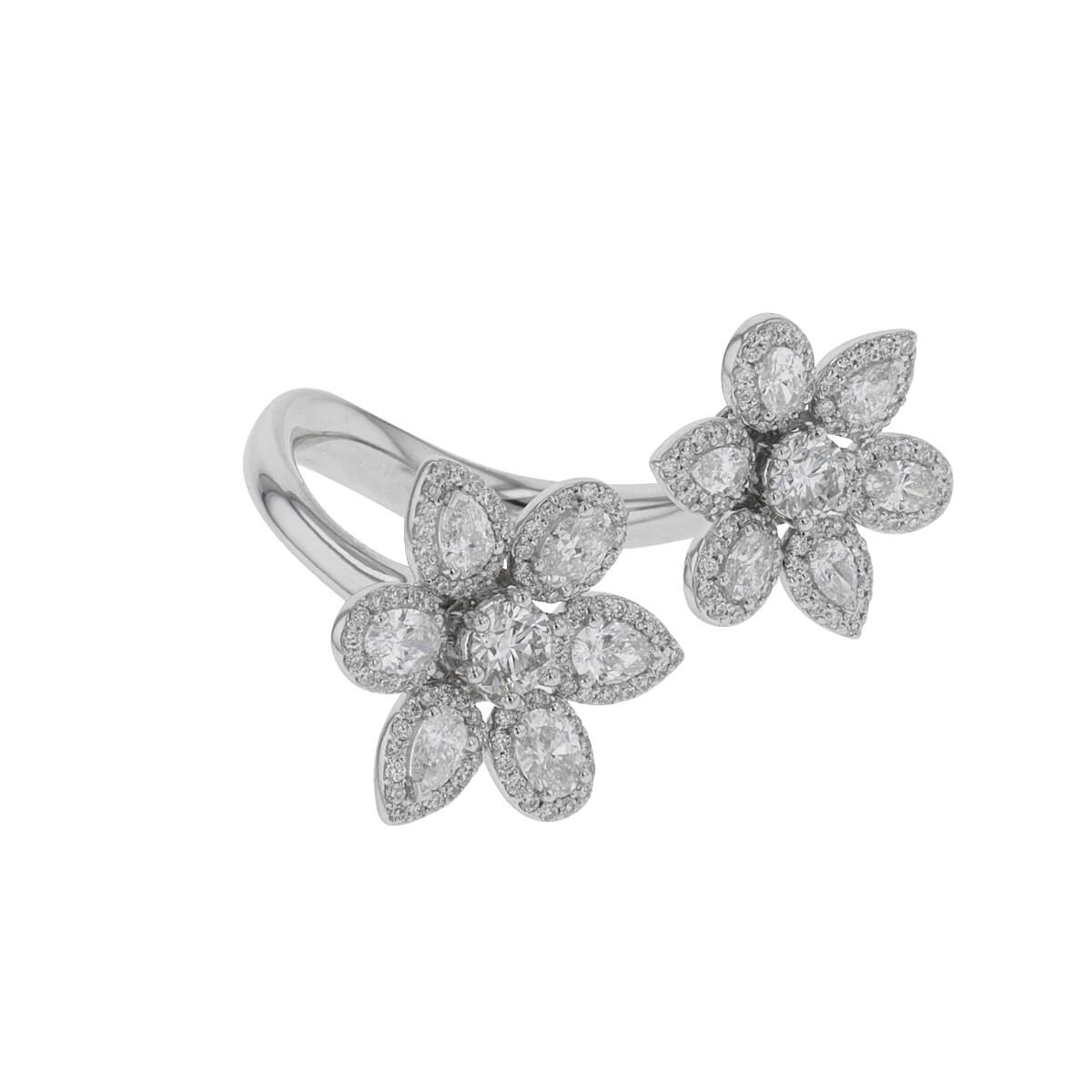 Bague en or blanc, centrée de deux motifs de fleurs serties de diamants taille poire, taille ovale et taille rond facetté.
