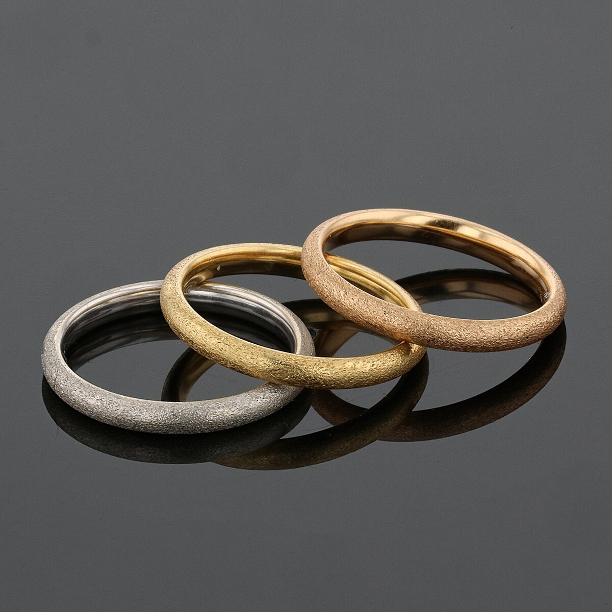 Ensemble de trois alliances en or brossé blanc, rose et jaune.