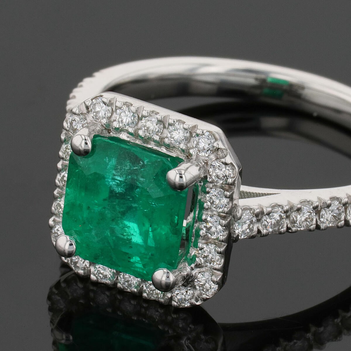Bague en or blanc, centrée d’une émeraude Colombienne carrée dans un entourage de diamants, l’anneau partiellement serti de diamants. Accompagnée d’un certificat LFG.