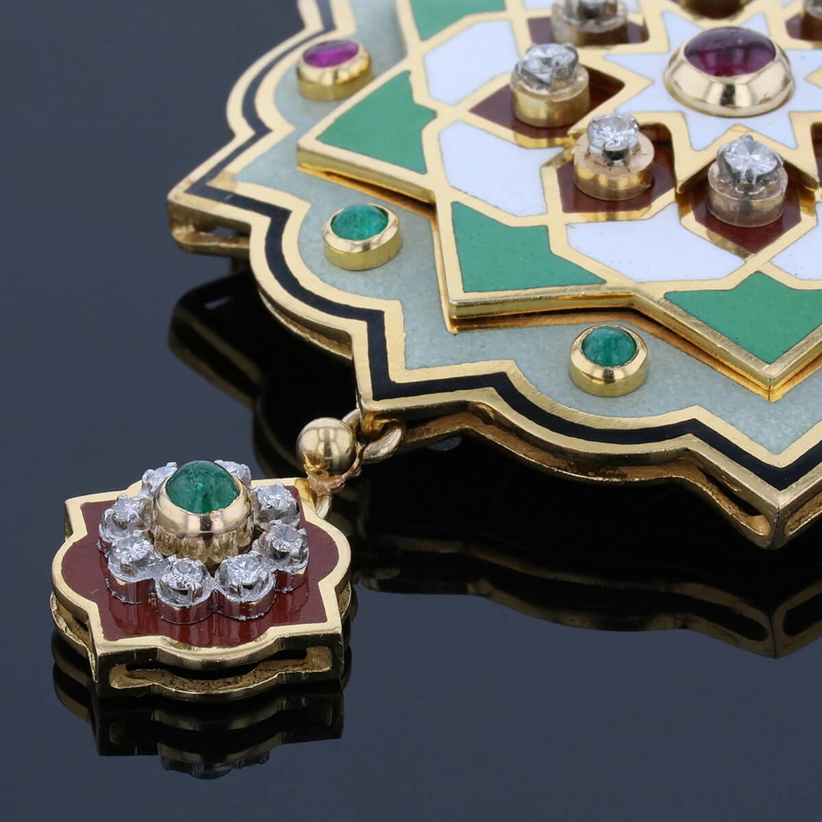 Broche en or jaune, composées de 2 motifs orientaux en émail rehaussé de cabochons de rubis, de saphirs, d’émeraudes et de diamants taille rond facetté.