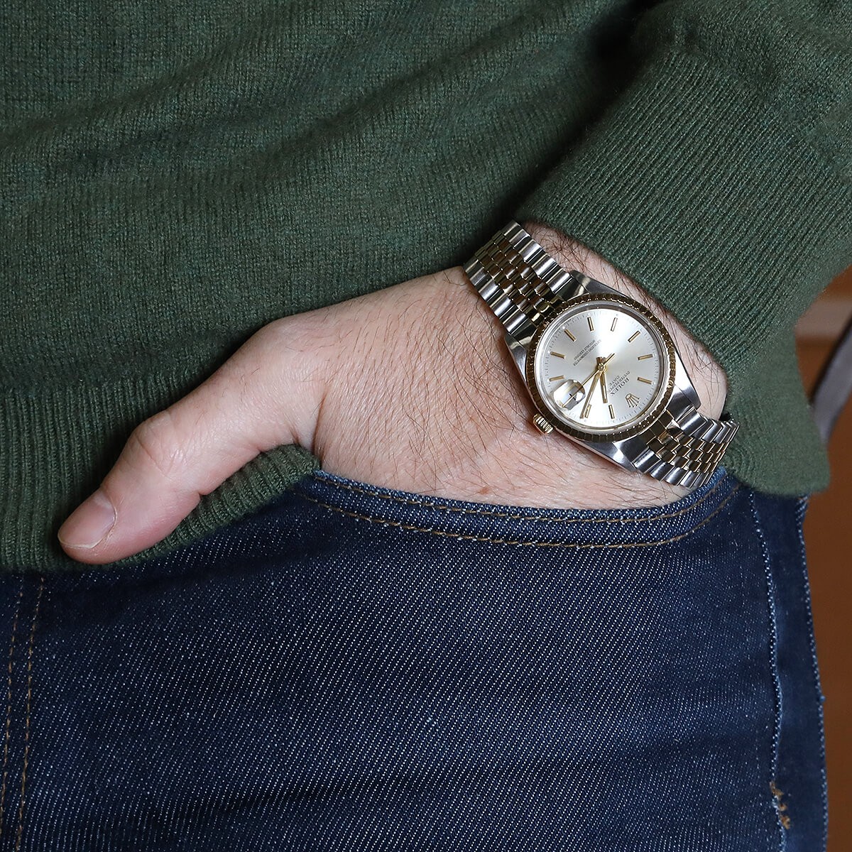 Montre bracelet en or jaune et acier, cadran champagne rayonnant avec index appliqués, chemin de fer pour les minutes, affichage de la date par guichet à 3 heures. Lunette cannelée en or jaune. Mouvement automatique. Bracelet or jaune et acier, maillons jubilé avec boucle déployante réglable en acier. Signée et numérotée. Légère rayure sur verre à 8 heures.