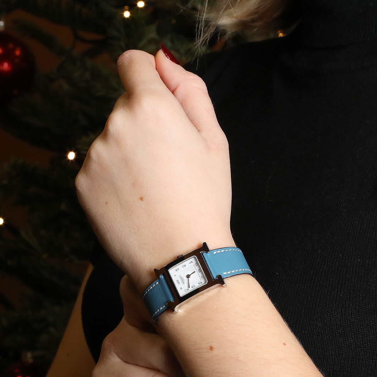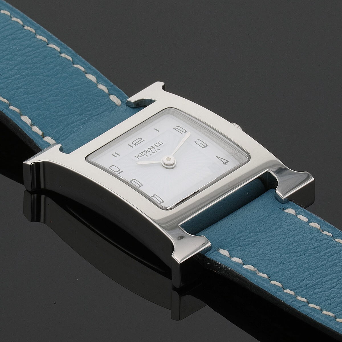 Montre bracelet de femme petit modèle en acier, cadran blanc stylisé avec chiffres arabes, lunette à décor de ''H''. Bracelet en cuir bleu signé avec boucle ardillon en acier. Signée et numérotée.