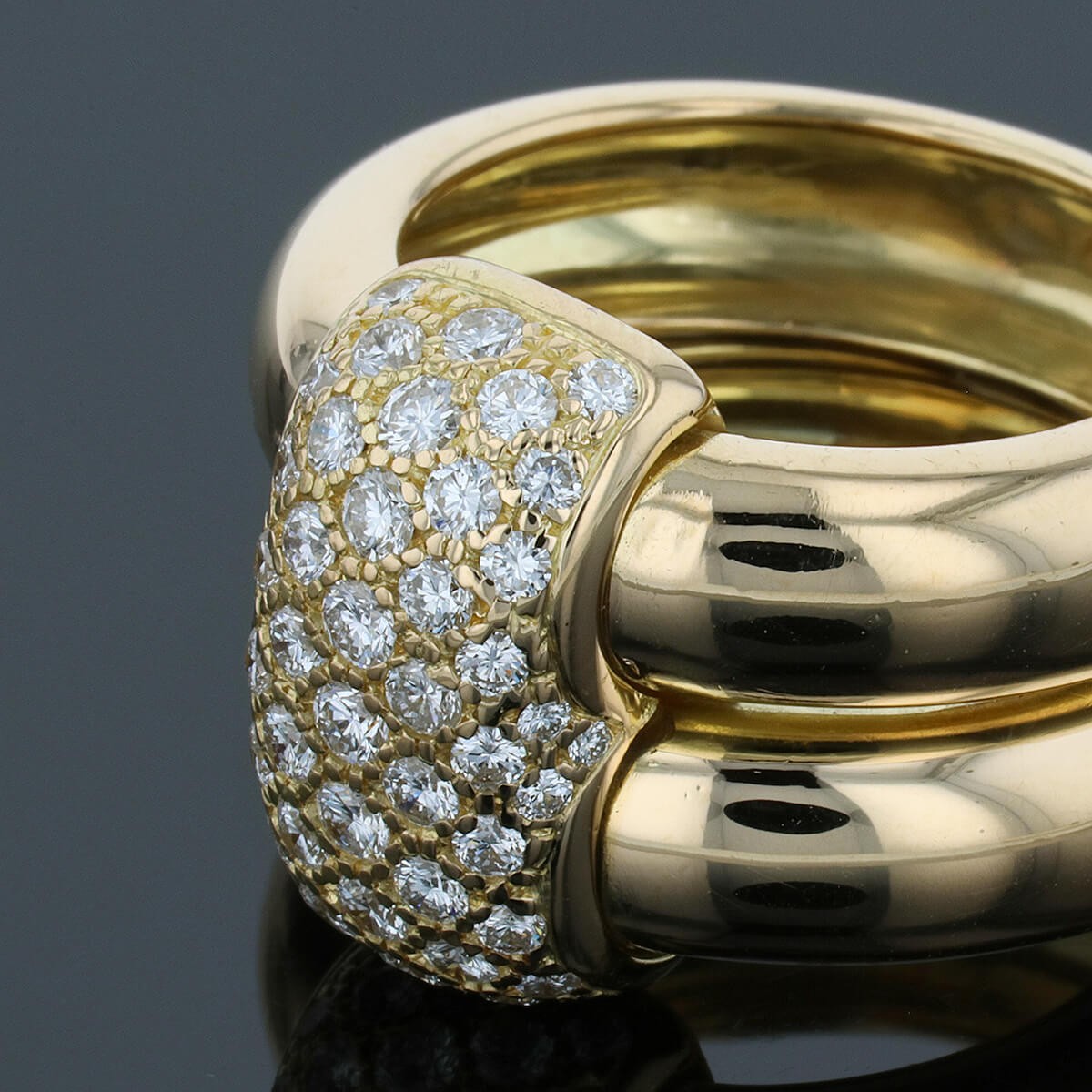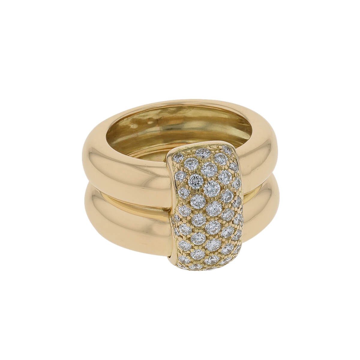 Bague en or jaune, composée de 2 anneaux retenus par un motif pavé de diamants. Signée et numérotée.