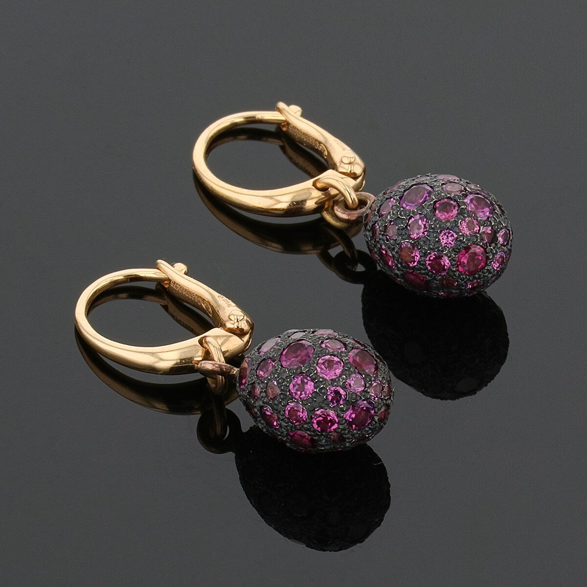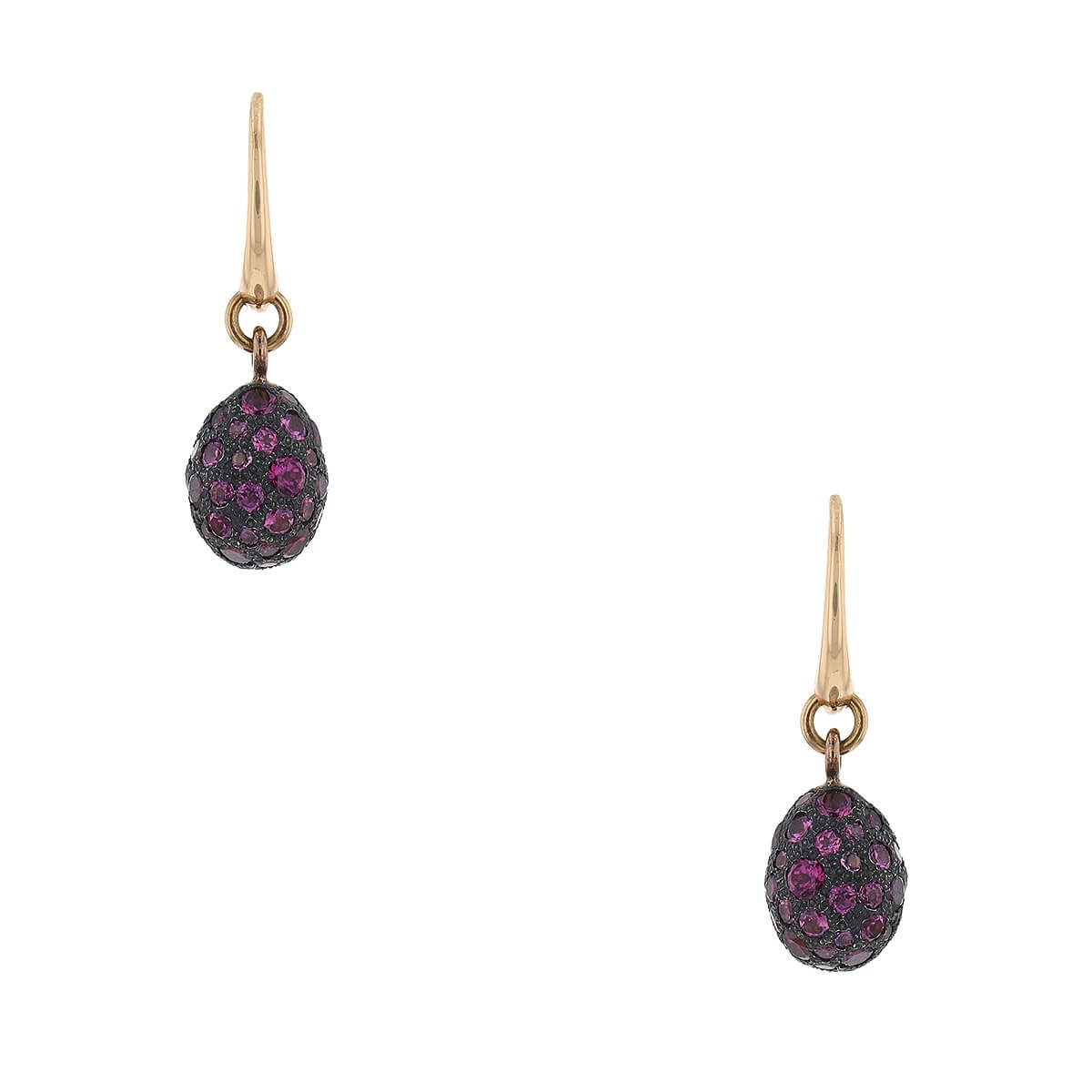 Boucles d’oreilles en or rose et argent, formant un anneau en or rose retenant en pampille un motif d’oeuf en argent serti de grenats rhodolites ronds facettés de différentes tailles. Signées et numérotées.