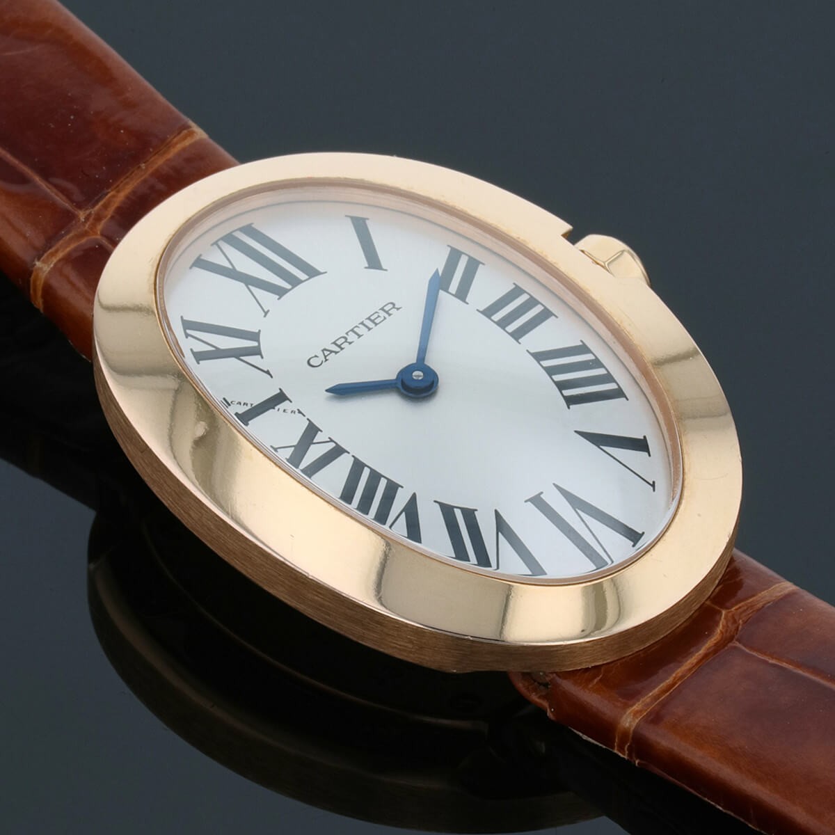 Montre bracelet de femme petit modèle en or rose, cadran argenté rayonnant avec chiffres romains peints. Mouvement quartz. Bracelet signé usagé en cuir cognac avec boucle ardillon signée en or rose. Signée et numérotée.