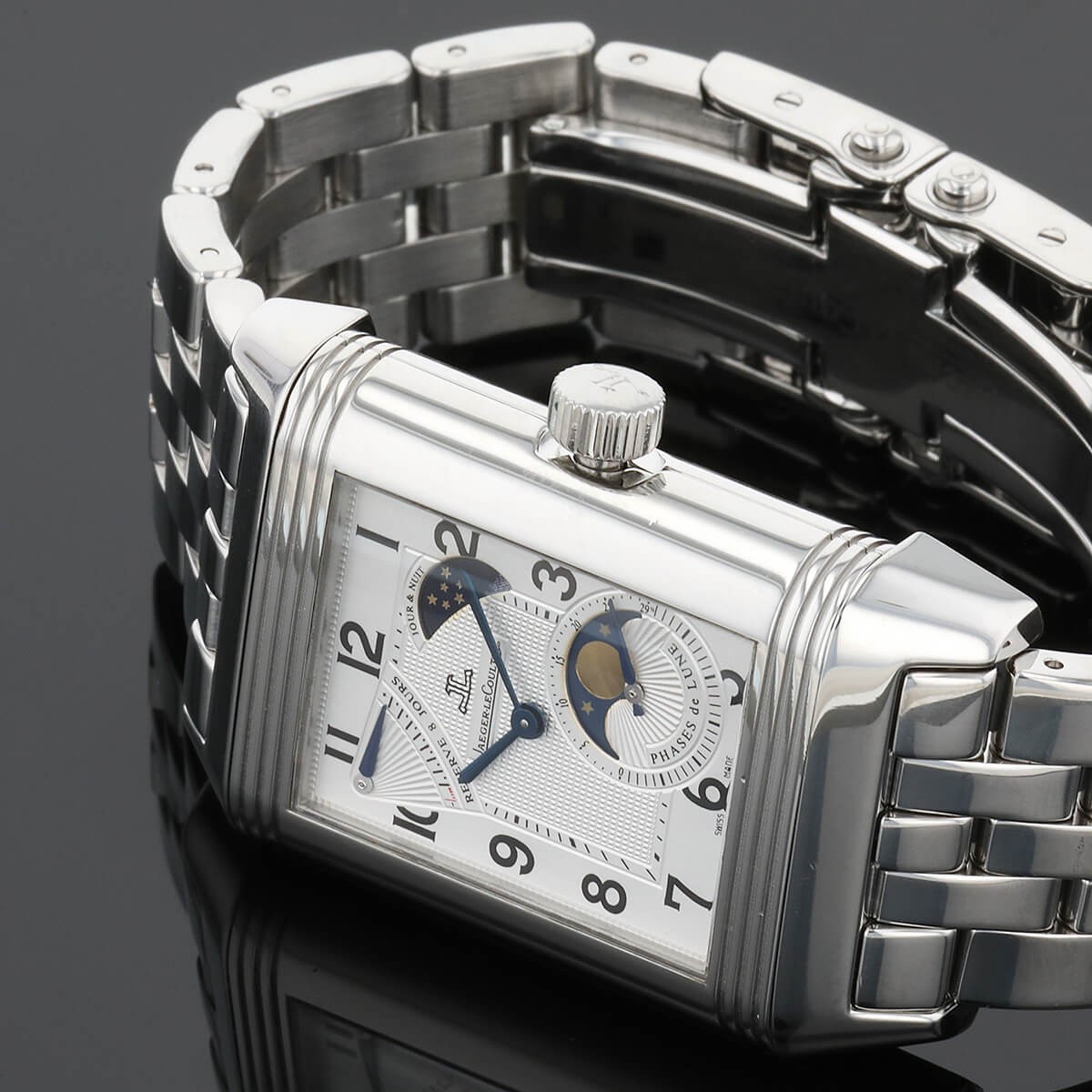 Montre bracelet d’homme en acier, boîtier réversible dévoilant d’un côté un cadran argenté avec chiffres arabes peints, indicateur jour et nuit à 2 heures, affichage de la phase de lune à 5 heures, indicateur de réserve de marche à 10 heures, l’autre côté du boîtier dévoilant son mouvement mécanique. Bracelet en acier boucle déployante réglable en acier. Signée et numérotée.