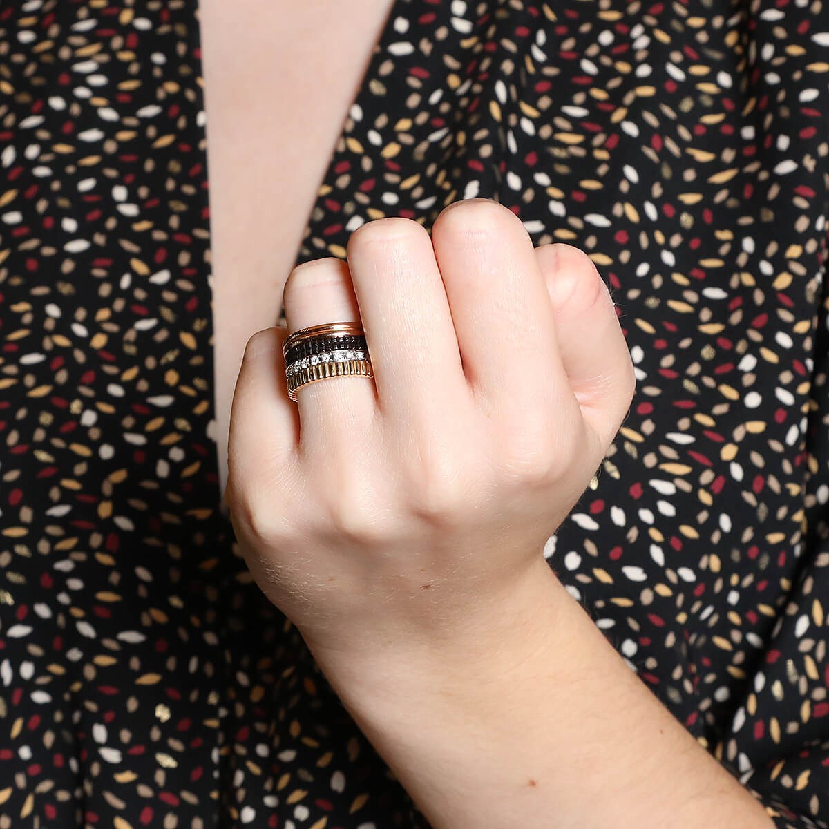 Bague large 4 tons d'or, stylisant 4 anneaux travaillés en relief aux motifs lisse poli, clous de Paris en PVD marron, godrons et ligne de diamants. Signée et numérotée.