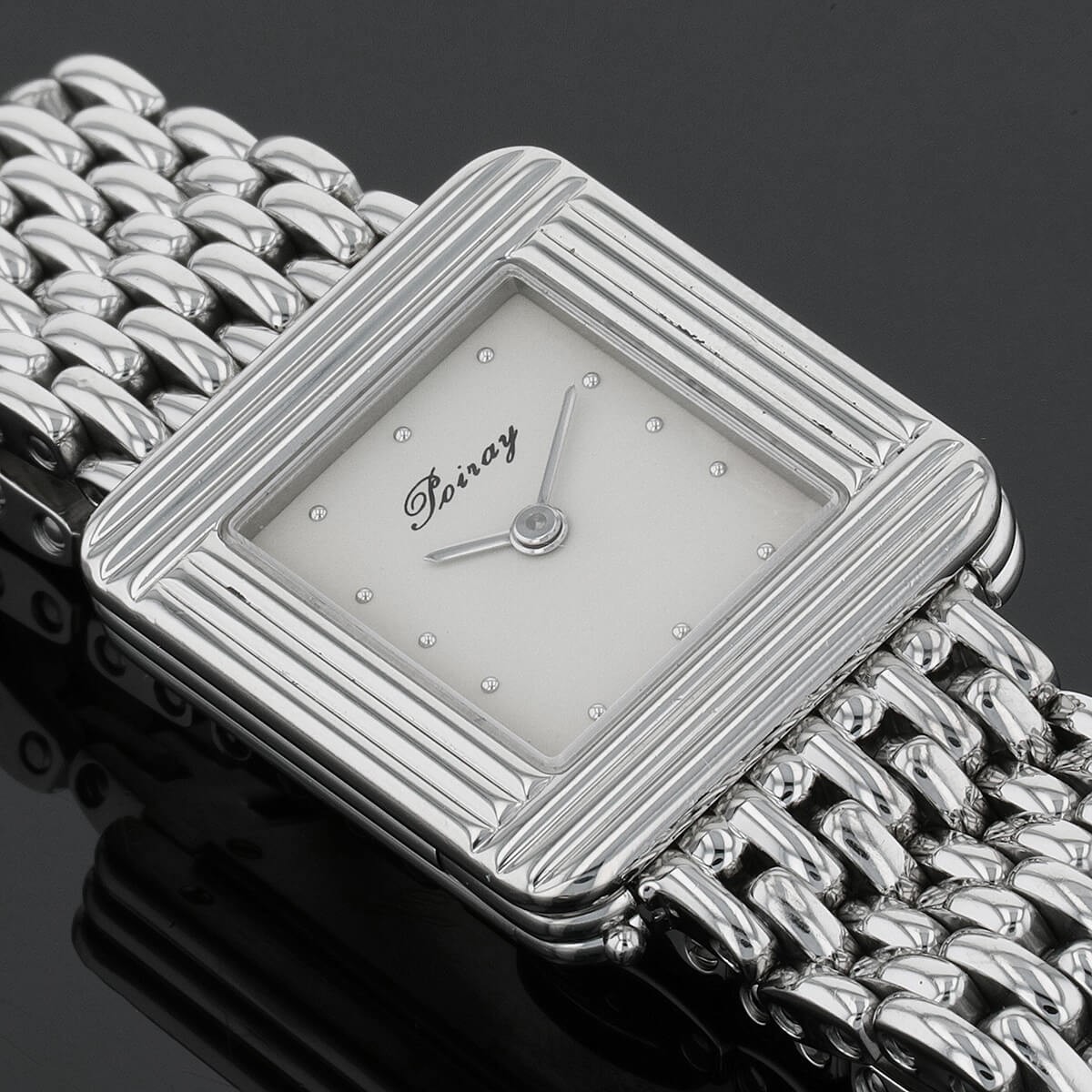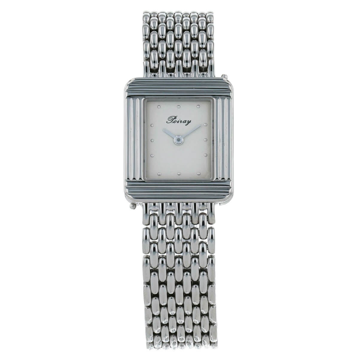 Montre bracelet de femme en acier, cadran crème avec index appliqués, lunette godronnée. Mouvement quartz. Bracelet interchangeable en acier, maillons grains de riz avec boucle déployante en acier. Signée et numérotée.