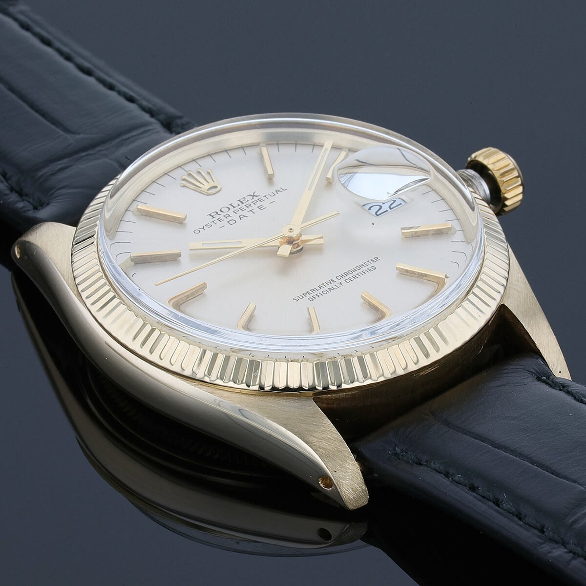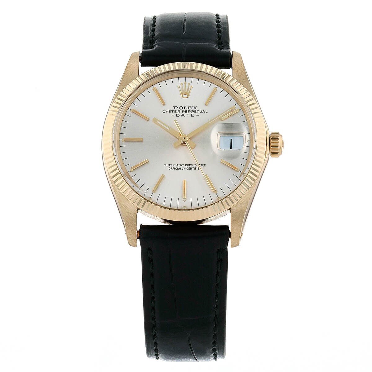 Montre bracelet en or jaune, cadran champagne rayonnant avec index appliqués, chemin de fer pour les minutes, affichage de la date par guichet à 3 heures, lunette cannelée en or jaune. Mouvement automatique. Bracelet neuf rapporté en crocodile noir avec boucle ardillon siglée en métal plaqué or. Signée et numérotée.