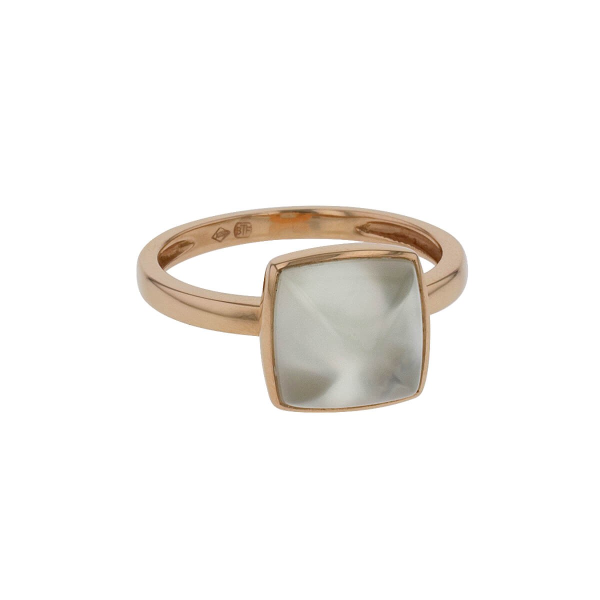 Bague en or rose, centrée d’un cabochon en pain de sucre en prehnite sur nacre blanche. Signée.