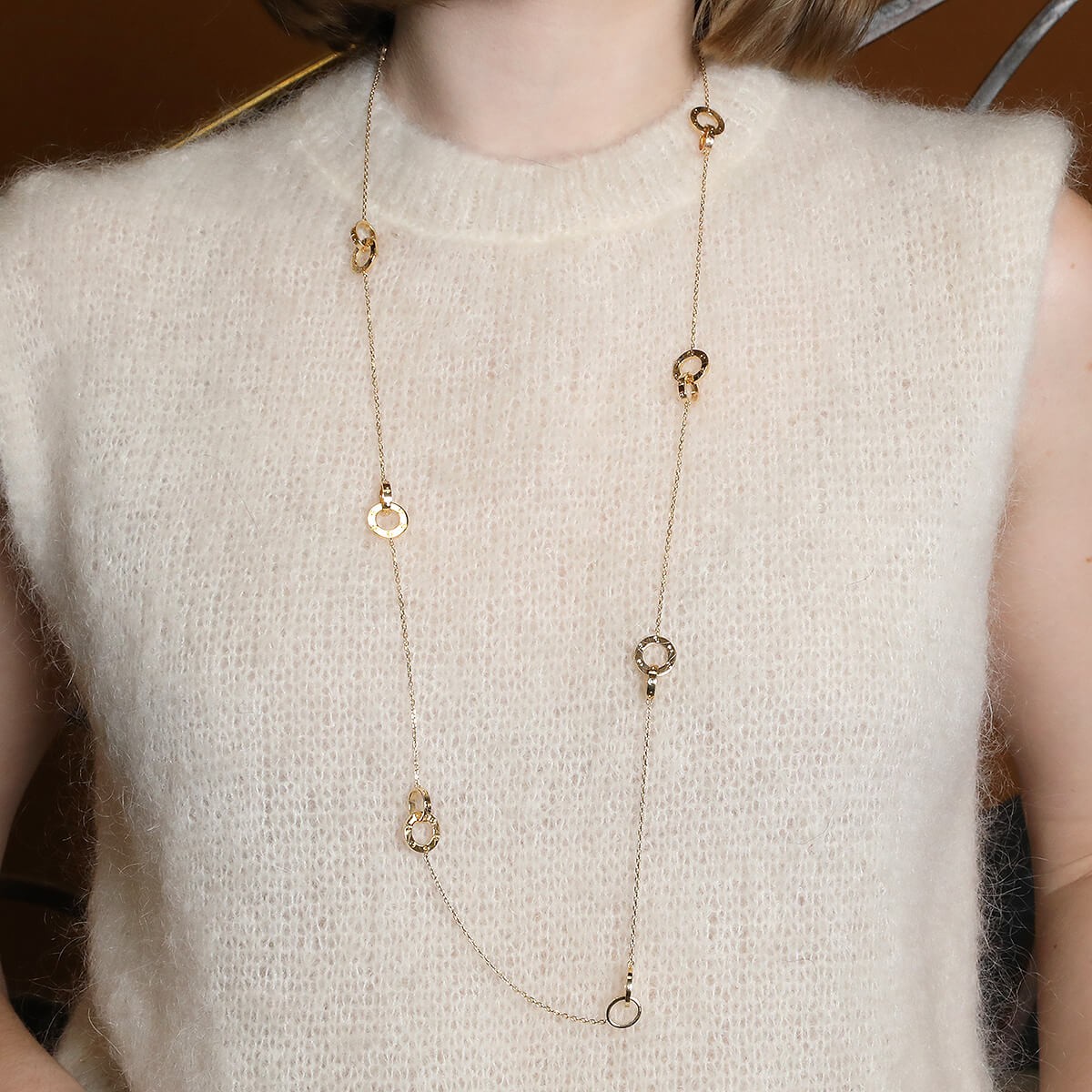 Collier sautoir en or jaune, maille forçat ponctuée de 3 motifs entrelacés à décor de vis. Signé et numéroté.