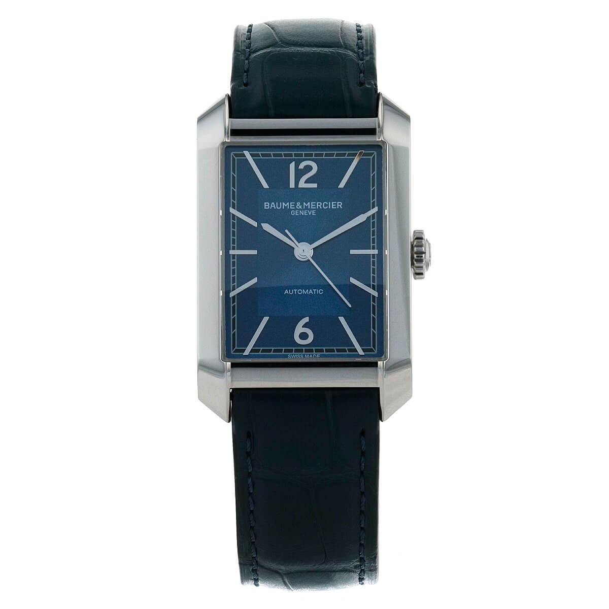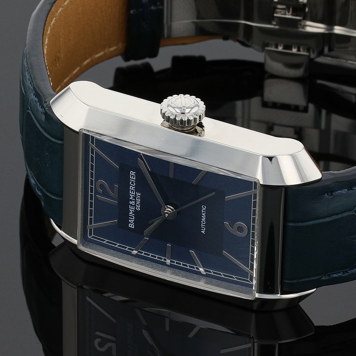 Montre bracelet en acier, cadran bleu avec chiffres arabes et index appliqués, chemin de fer pour les minutes. Fond transparent laissant apparaître son mouvement automatique. Bracelet en crocodile bleu avec boucle déployante en acier. Signée et numérotée.