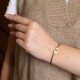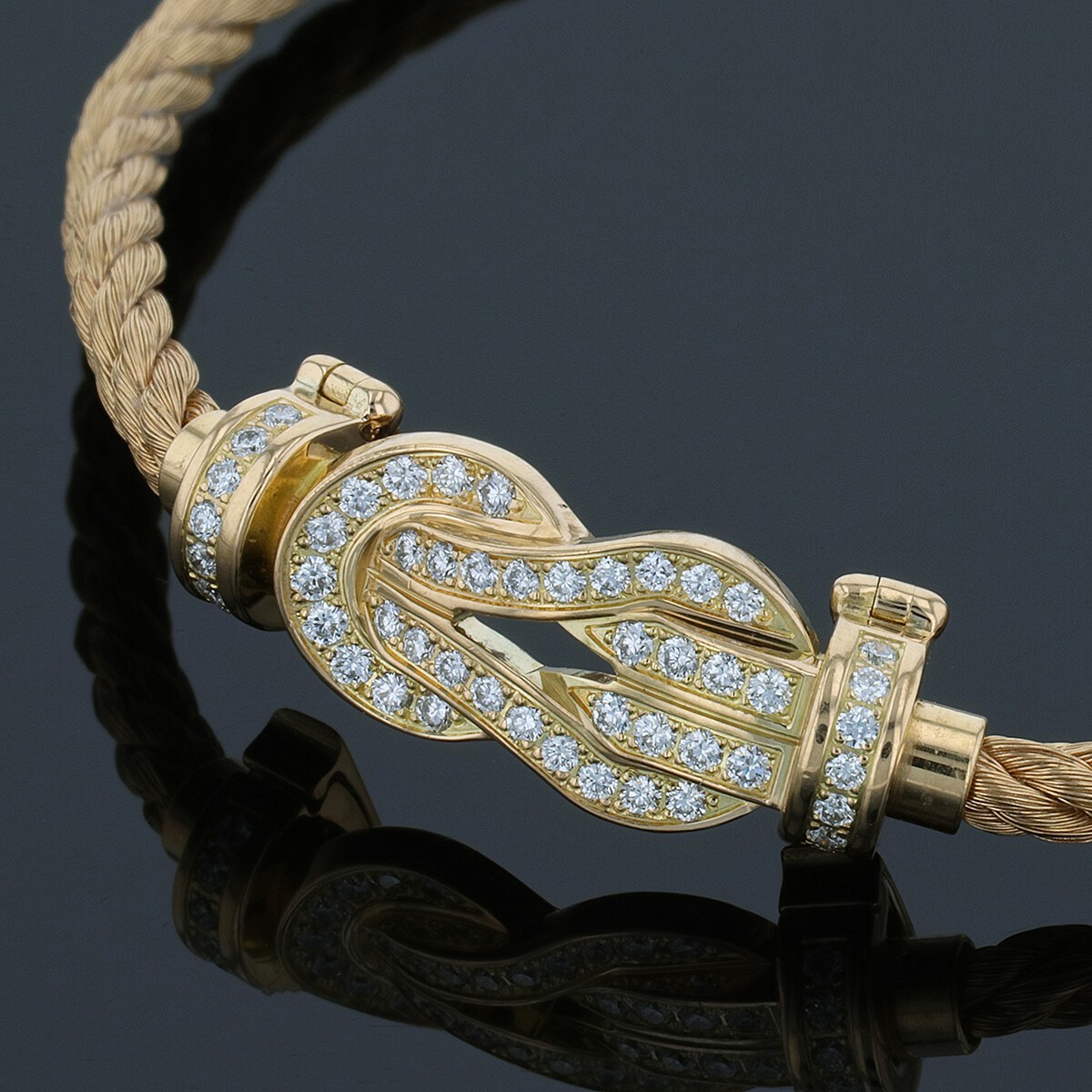 Bracelet moyen modèle stylisant un motif noeud d’hercule en or jaune serti de diamants, retenu par un câble en or jaune torsadé interchangeable. Signé et numéroté. Avec ajout de deux systèmes de sécurité au niveau des fermoirs.