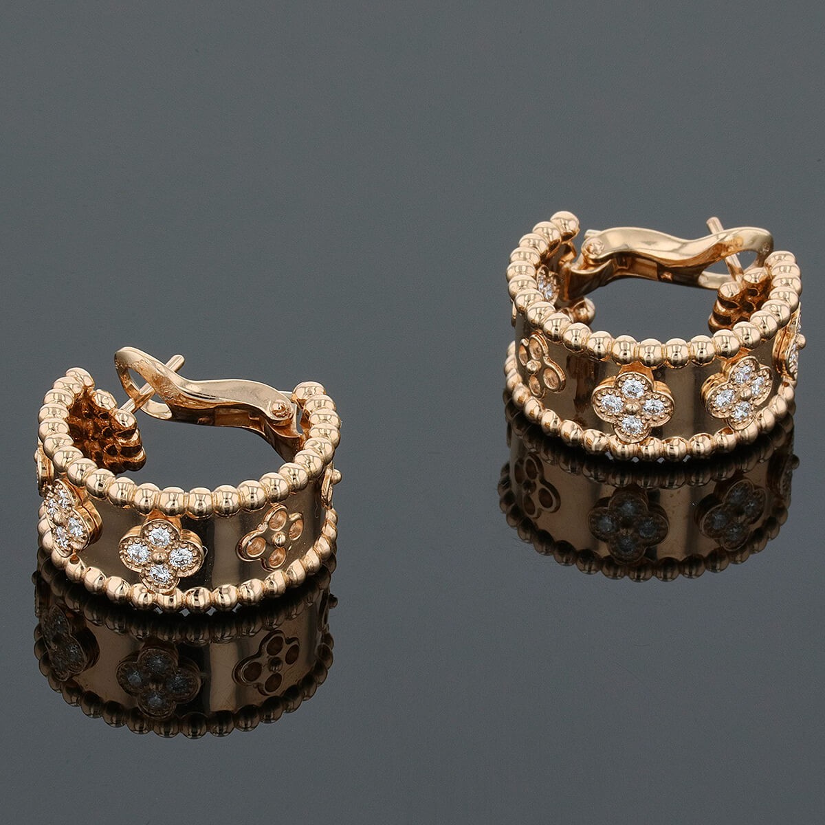 Boucles d’oreilles en or rose, à décor de motifs Alhambra ornés de diamants les bordures perlées. Signées et numérotées.