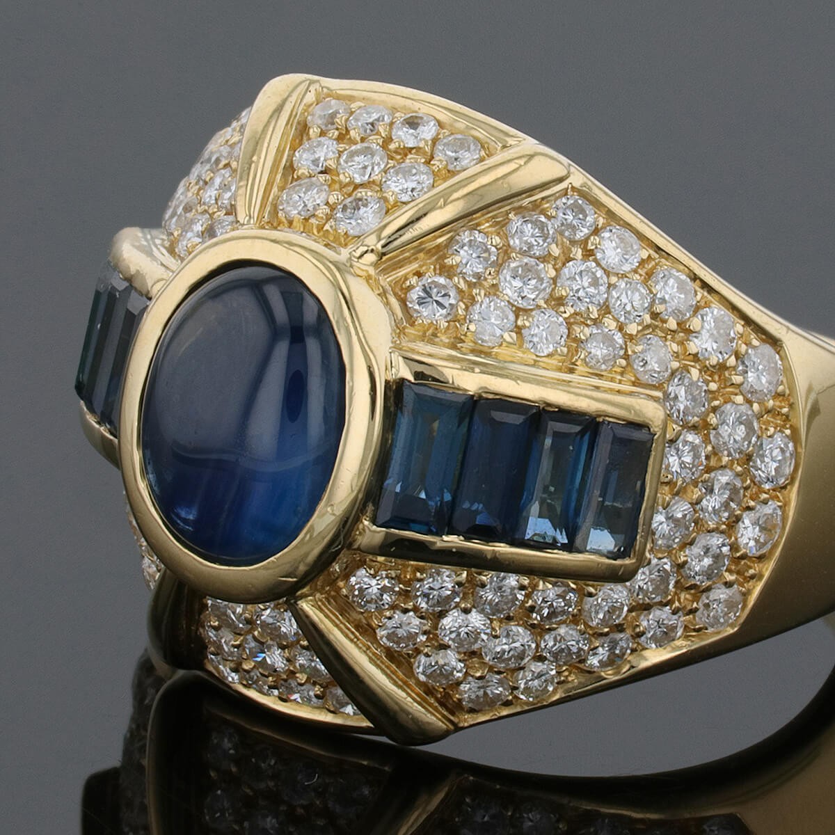 Bague en or jaune, centrée d’un pavage de diamants rehaussé d’un saphir taille cabochon en serti clos d’environ 1,5 ct épaulé de 8 saphirs calibrés.