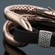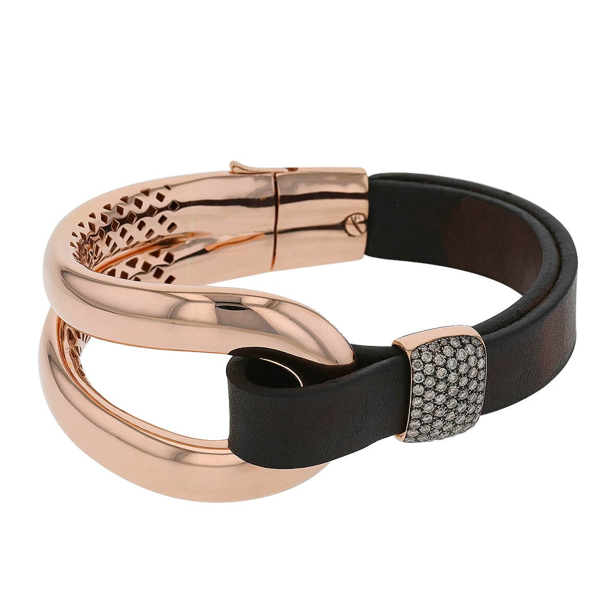 Bracelet en or rose, formant une importante boucle en or retenue par un lien en cuir rehaussé d’un pavage de diamants cognac, agrémenté d’un fermoir à cliquet avec sécurité.