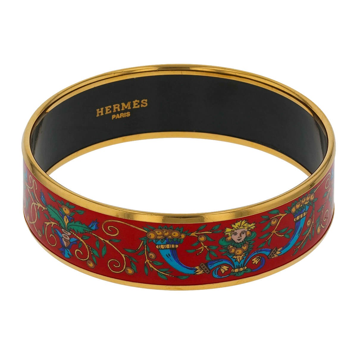Bracelet en métal doré et émail, à décor de cornes d’abondance, de feuillages et de rinceaux dans les tons bleu, vert et doré sur fond rouge. Signé.
